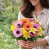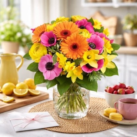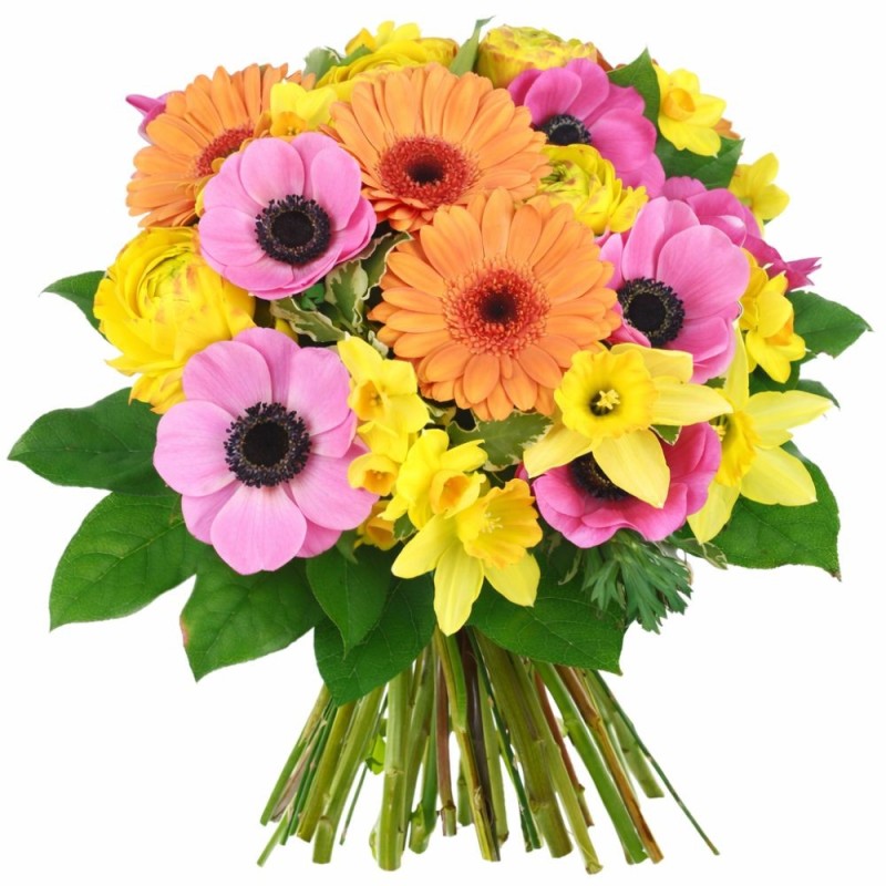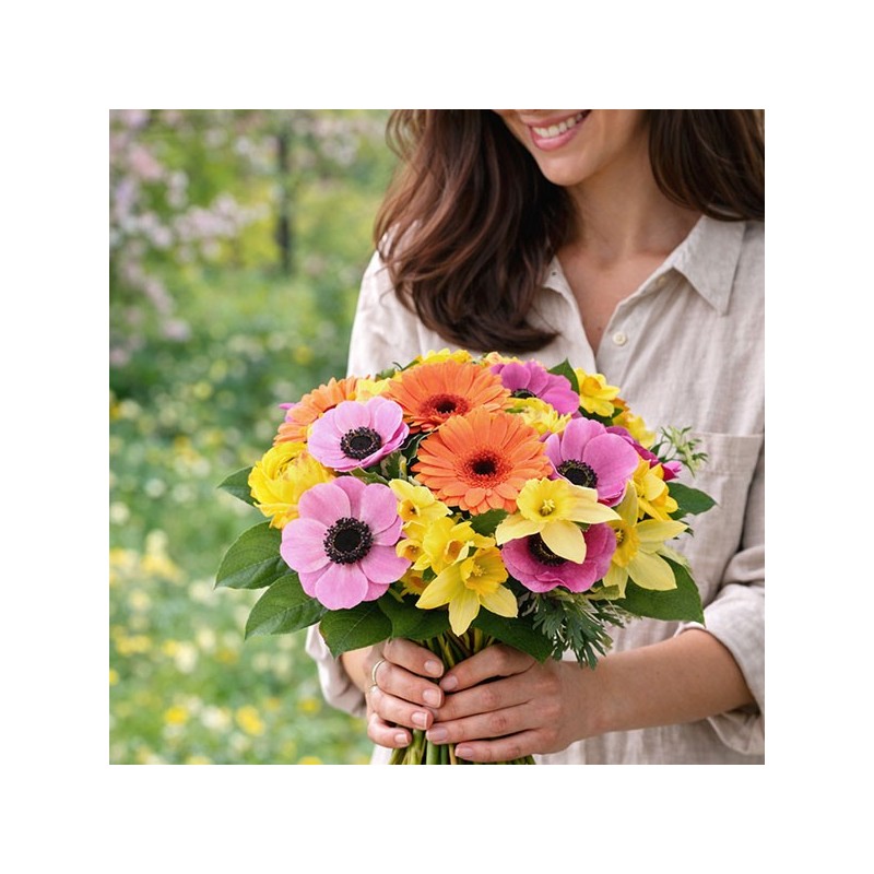 Bouquet dans les tons jaune, rose et orange, composé de jonquilles, gerberas, anémones et fleurs de saison, accompagné de divers feuillages.