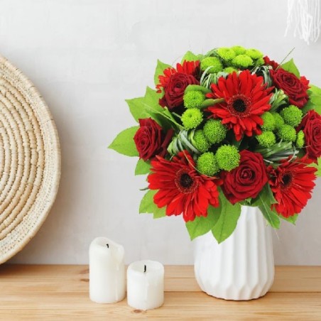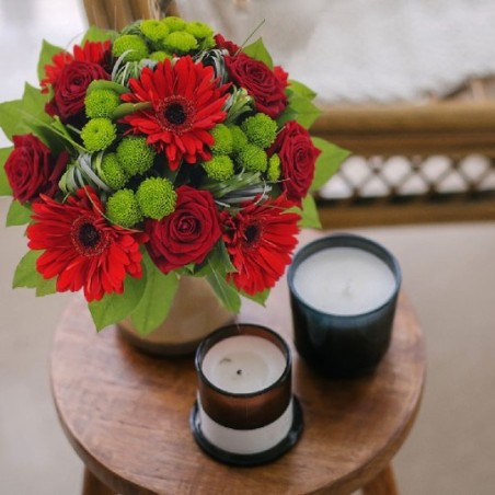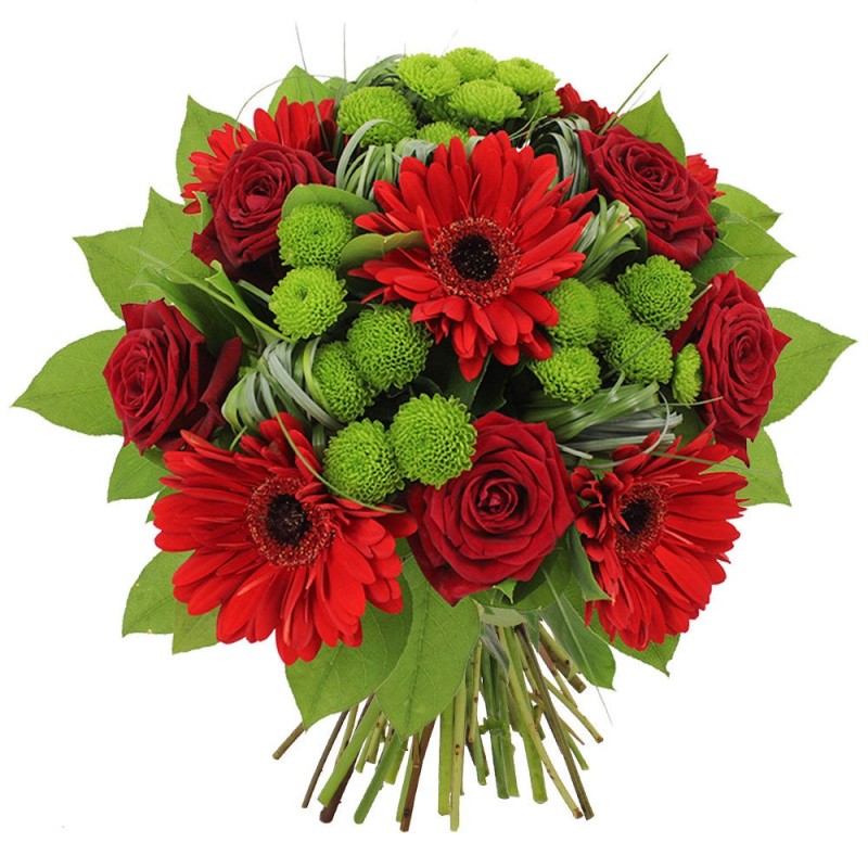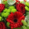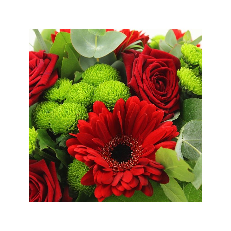 Bouquet rond dans les tons rouge et vert composé de roses, germinis, santinis et feuillages.