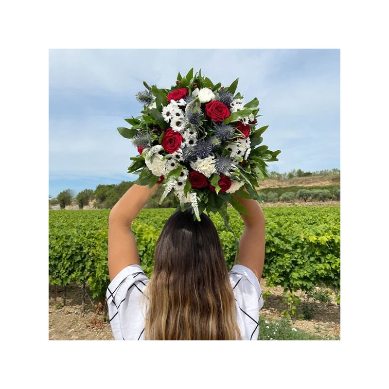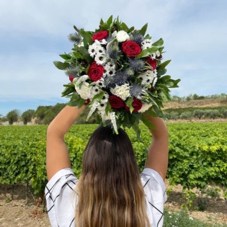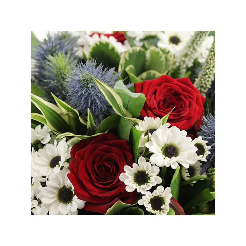 Bouquet rond dans les tons blanc, rouge et vert composé de roses, oeillets, chardons, fleurettes et feuillages.