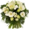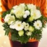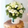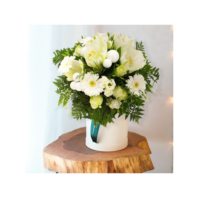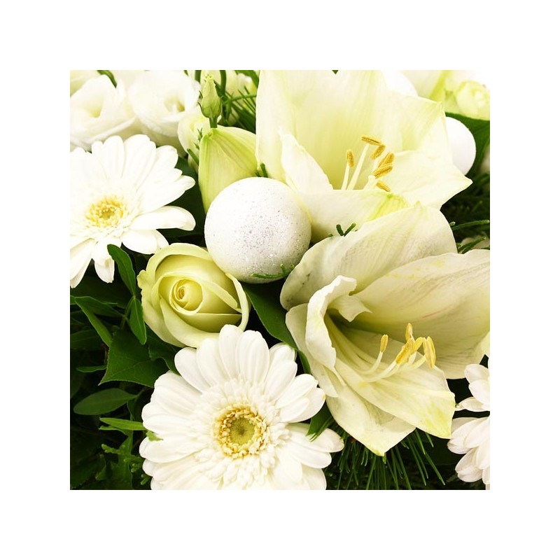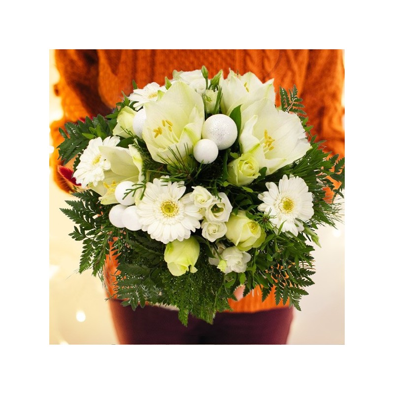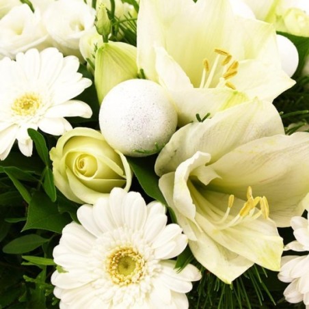 Bouquet rond dans les tons blanc et vert composé de germinis, amaryllis, décorations de Noël et autres fleurs de saison.