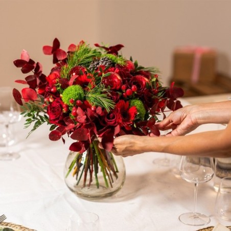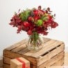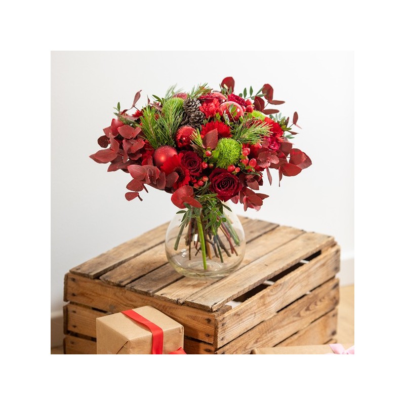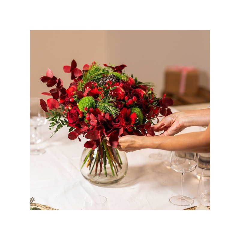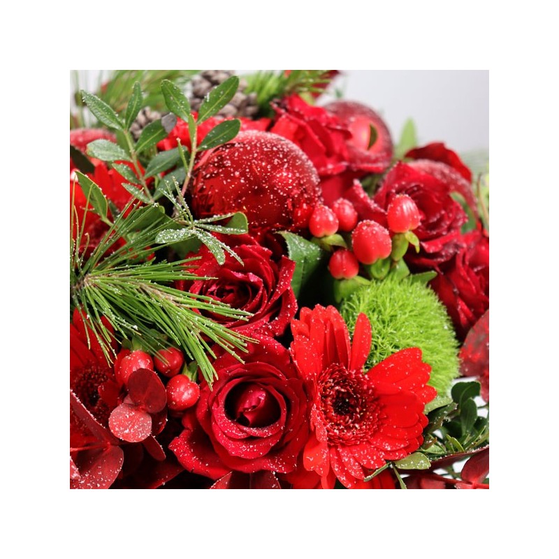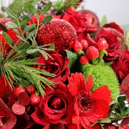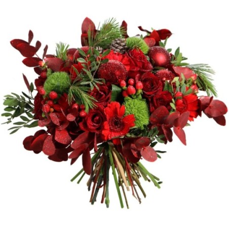 Bouquet de Noël dans les tons rouges composé de roses, gerberas, décorations de Noël, autres fleurs de saison et feuillage.