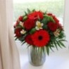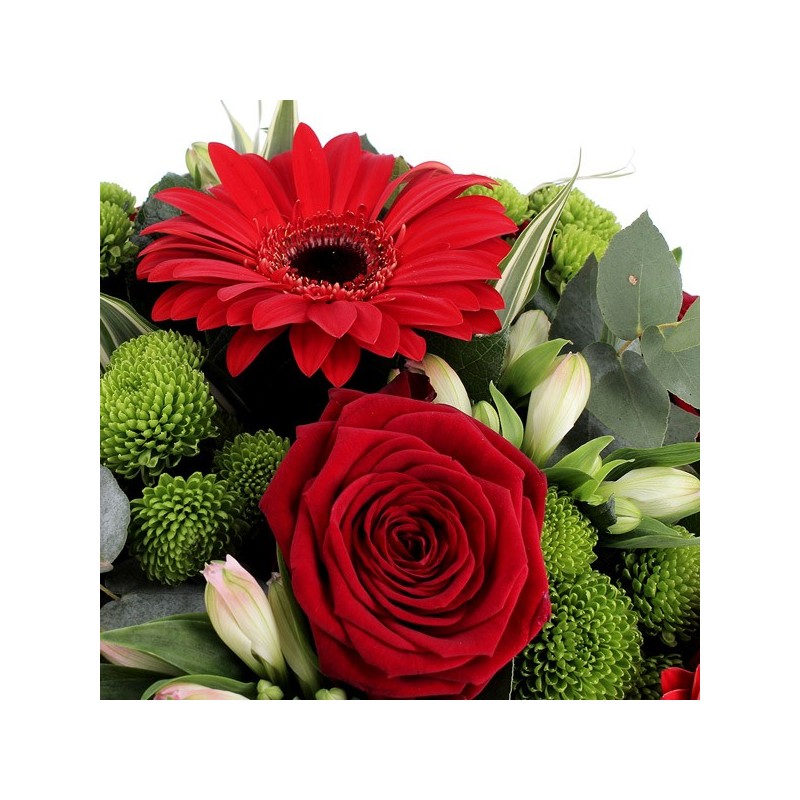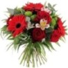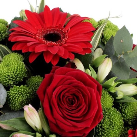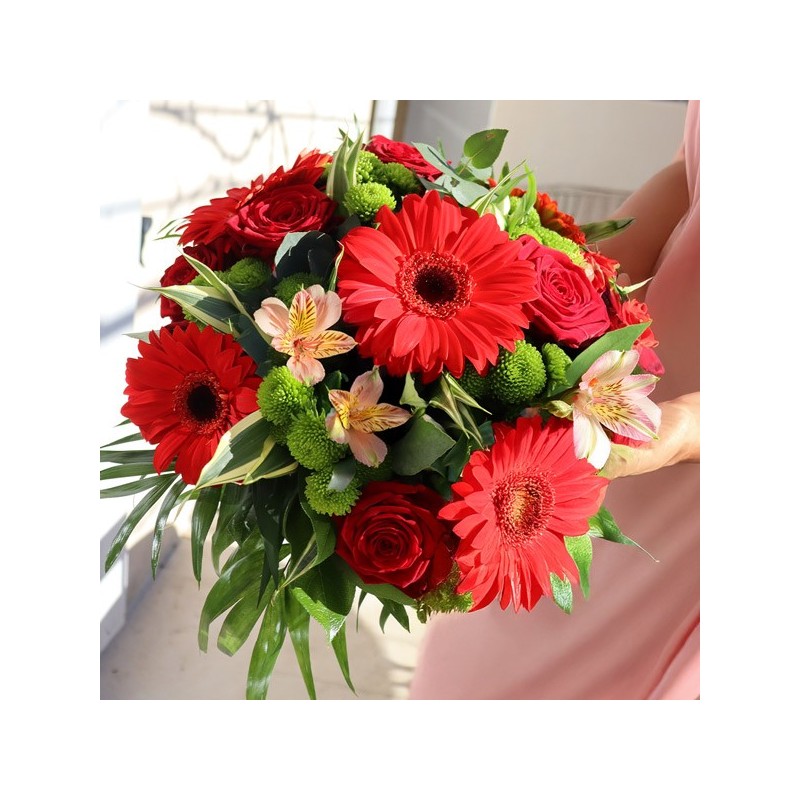 Bouquet rond dans les tons rouge, rose pâle et vert composé de roses, alstromérias, germinis et feuillages.