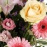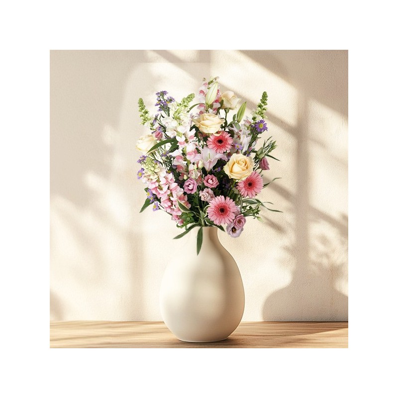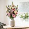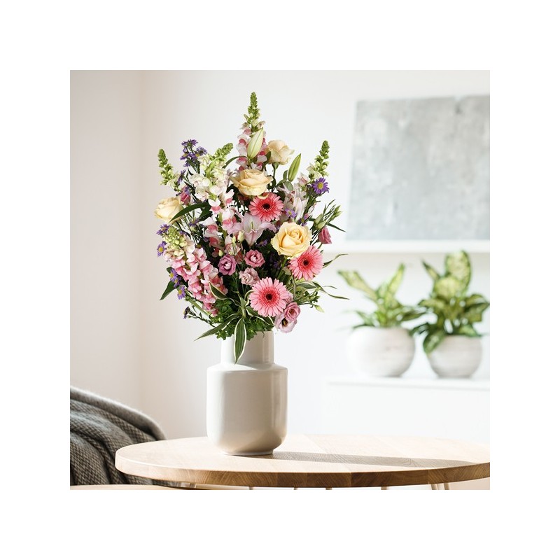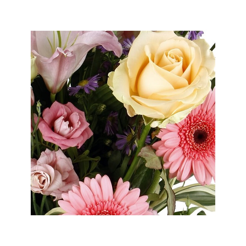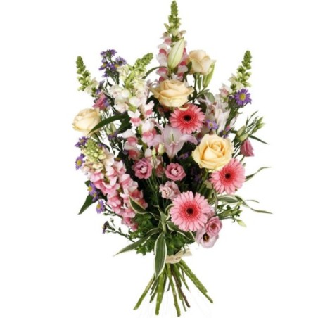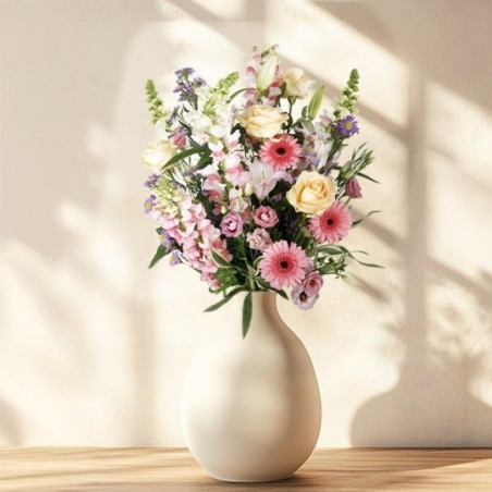 Bouquet longues tiges dans les tons rose pâle, crème et violet composé de roses, germinis, lys, lisianthus, muflier (selon disponibilité chez le fl...