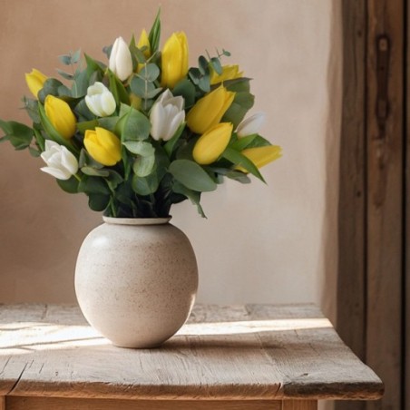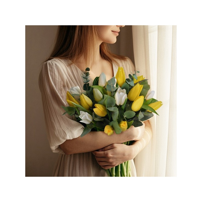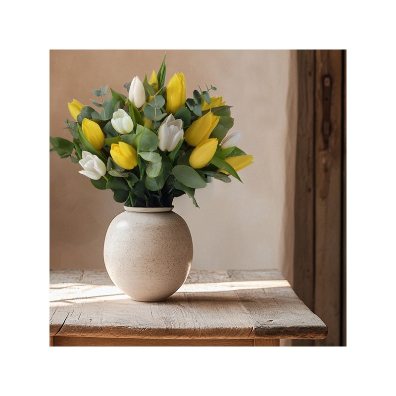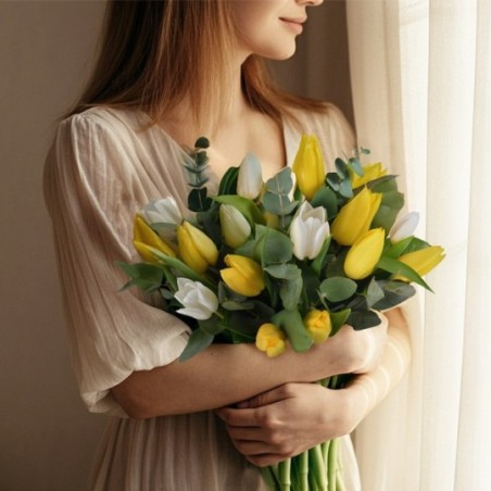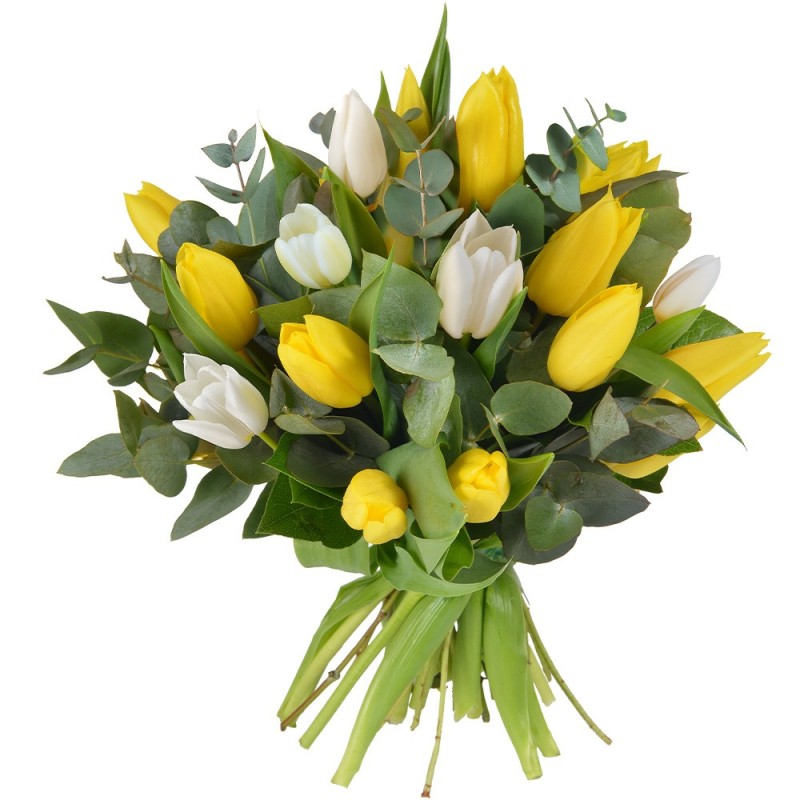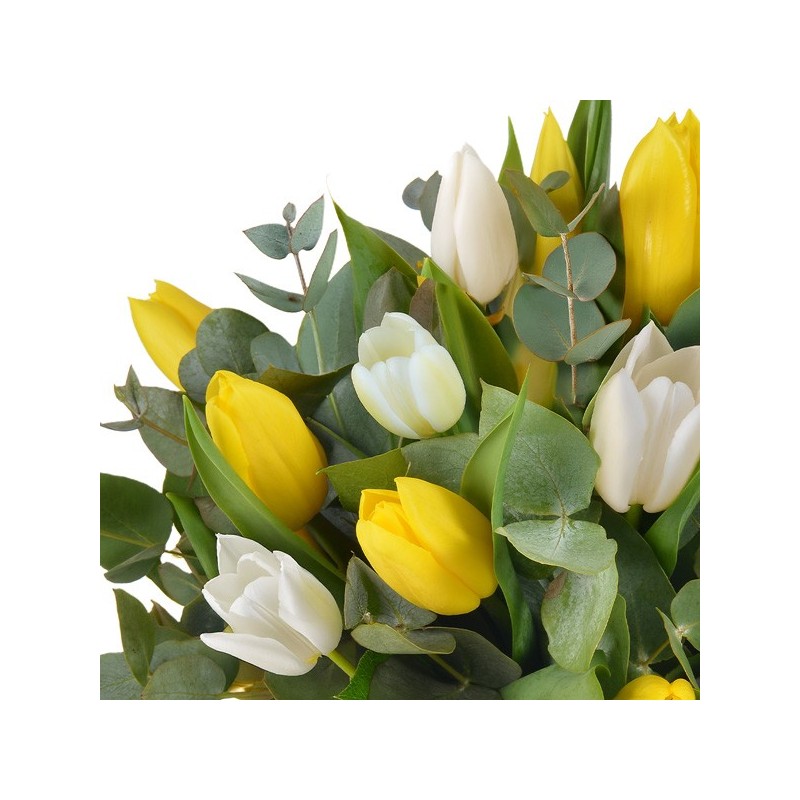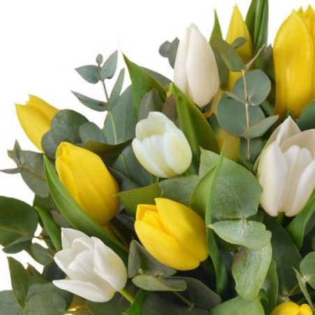 Bouquet rond composé de tulipes jaunes et blanches mises en valeur par quelques touches d'eucalyptus.