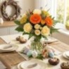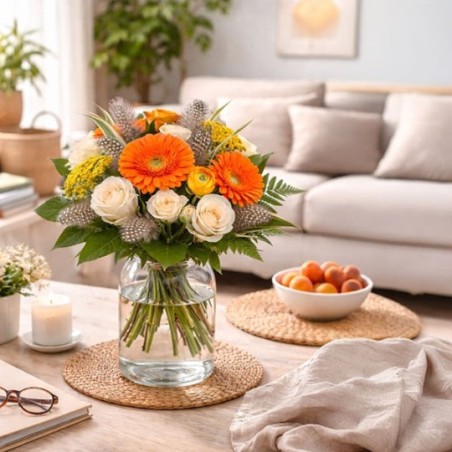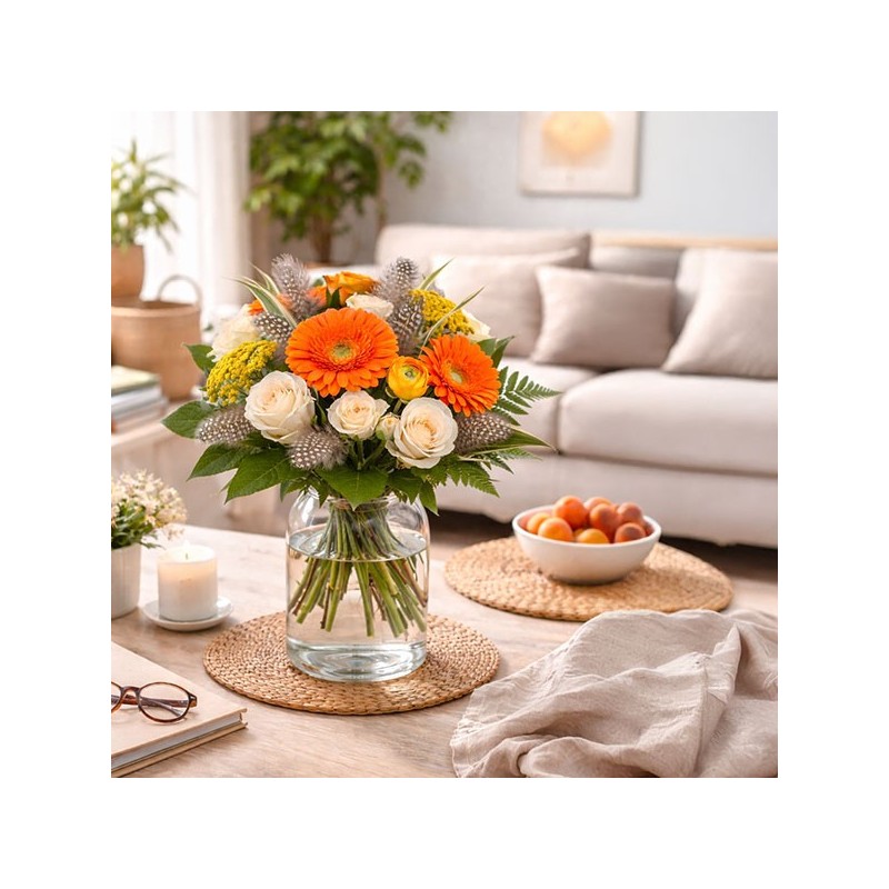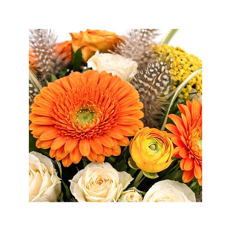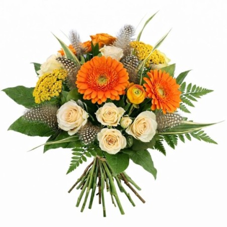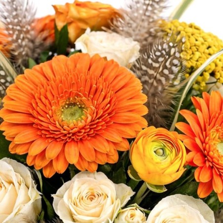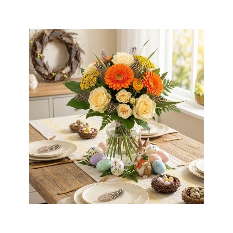 Bouquet de Pâques dans les tons orange et crème, composé de roses, gerberas, fleurs de saison et décorations de Pâques.