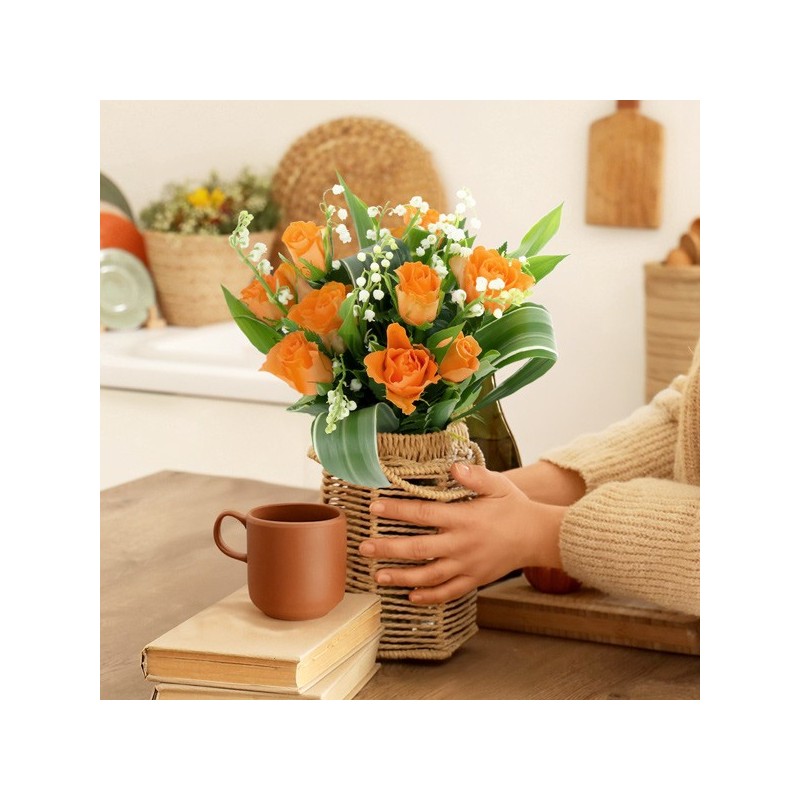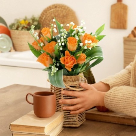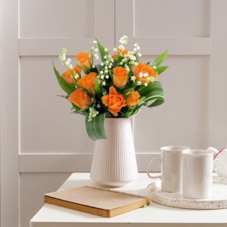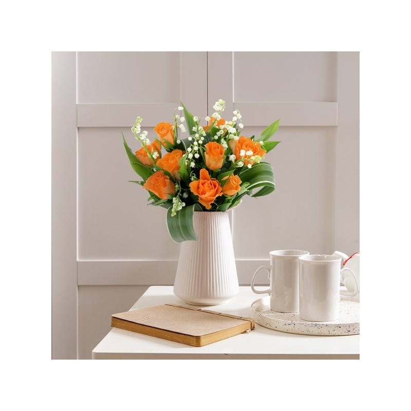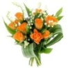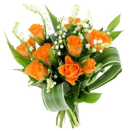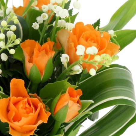 Bouquet composé de muguet et de roses orange.