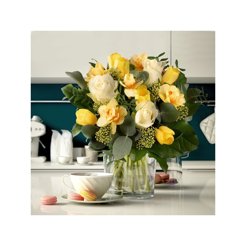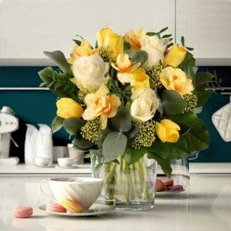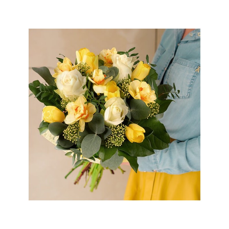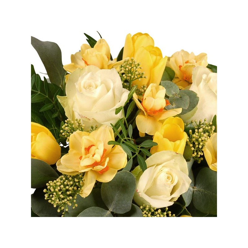Bouquet rond dans les tons jaune/oranger, blanc et vert composé de narcisses, tulipes jaunes, roses blanches et feuillages divers tels que de l'eucalyptus, du salal... (vase non compris).