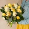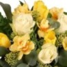 Bouquet rond dans les tons jaune/oranger, blanc et vert composé de narcisses, tulipes jaunes, roses blanches et feuillages divers tels que de l'...