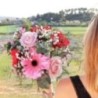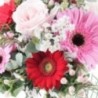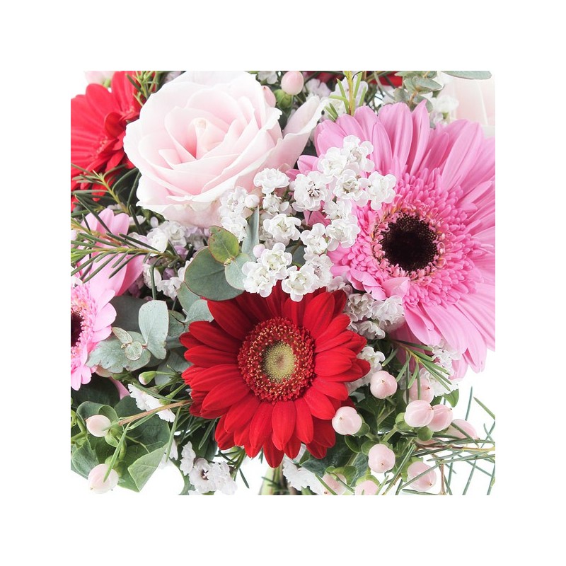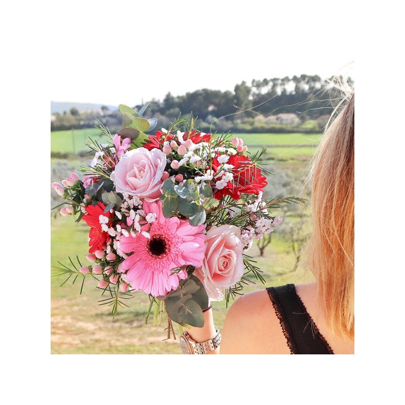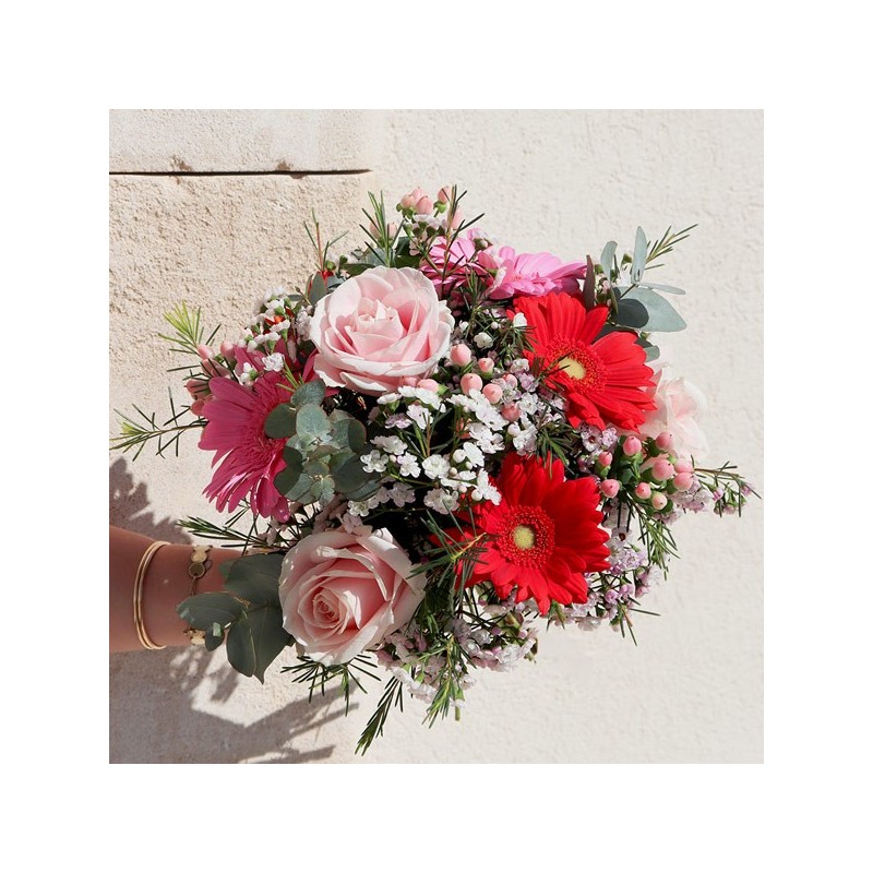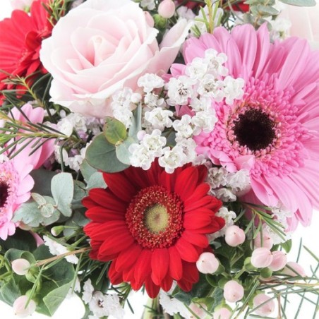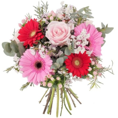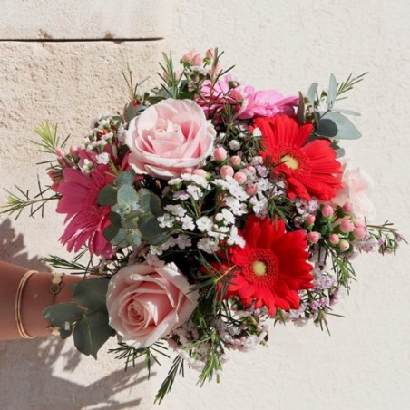 Bouquet dans les tons roses composé de roses, germinis, gerberas, hypericum, le tout accompagné de feuillage.