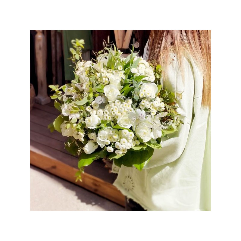 Bouquet rond dans les tons blanc et vert composé de roses, alstromérias, matricaires et feuillages.