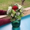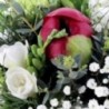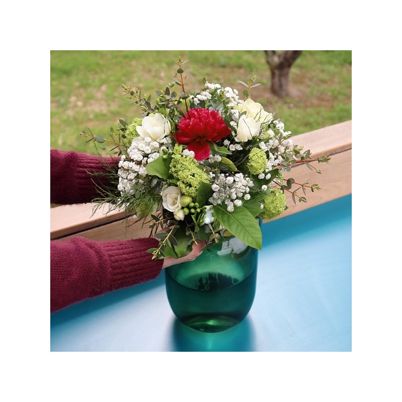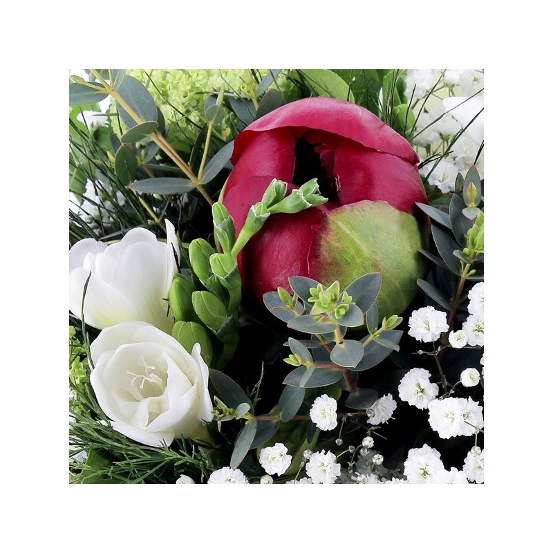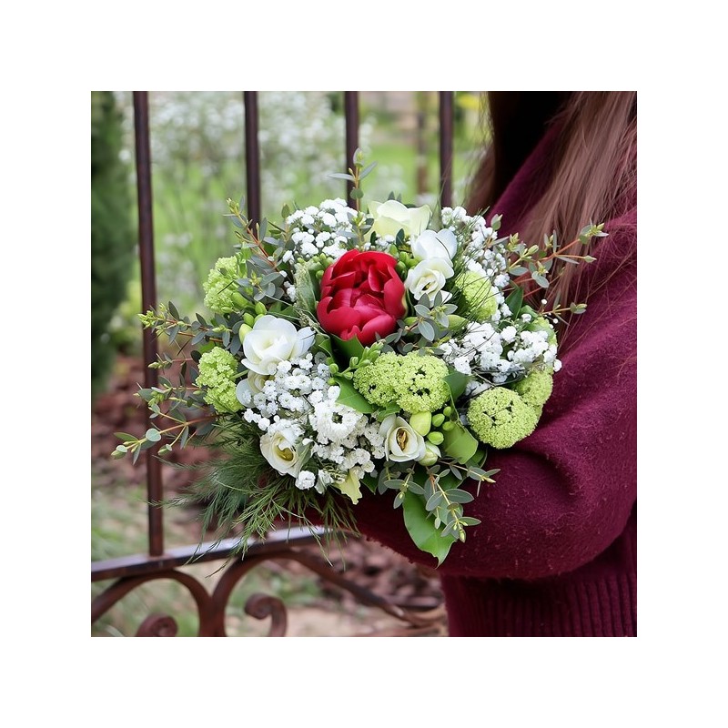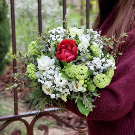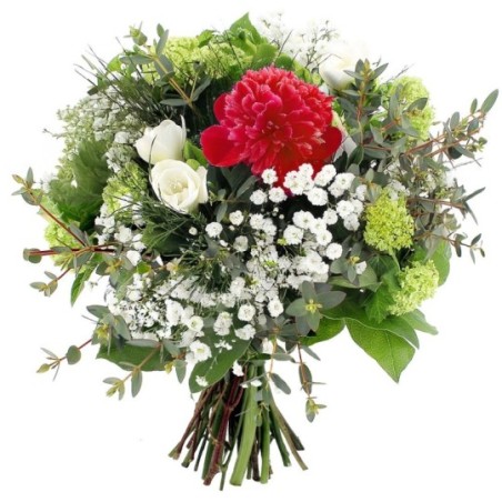 Bouquet dans les tons rouges et blancs, composé de pivoine, gypsophile, freesia, fleurettes champêtres et feuillage.