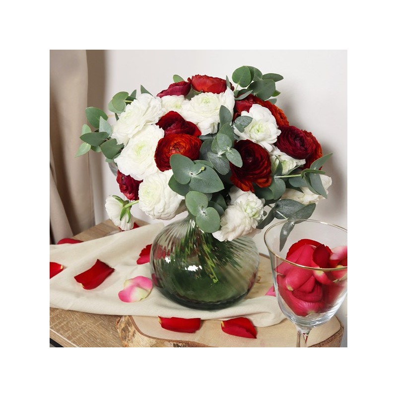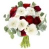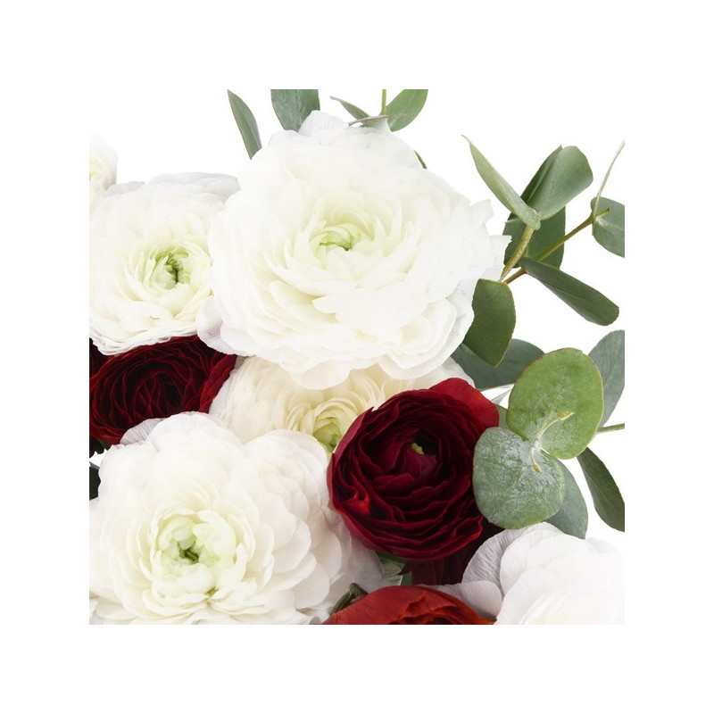 Bouquet blanc et rouge, composé de renoncules et de feuillages.