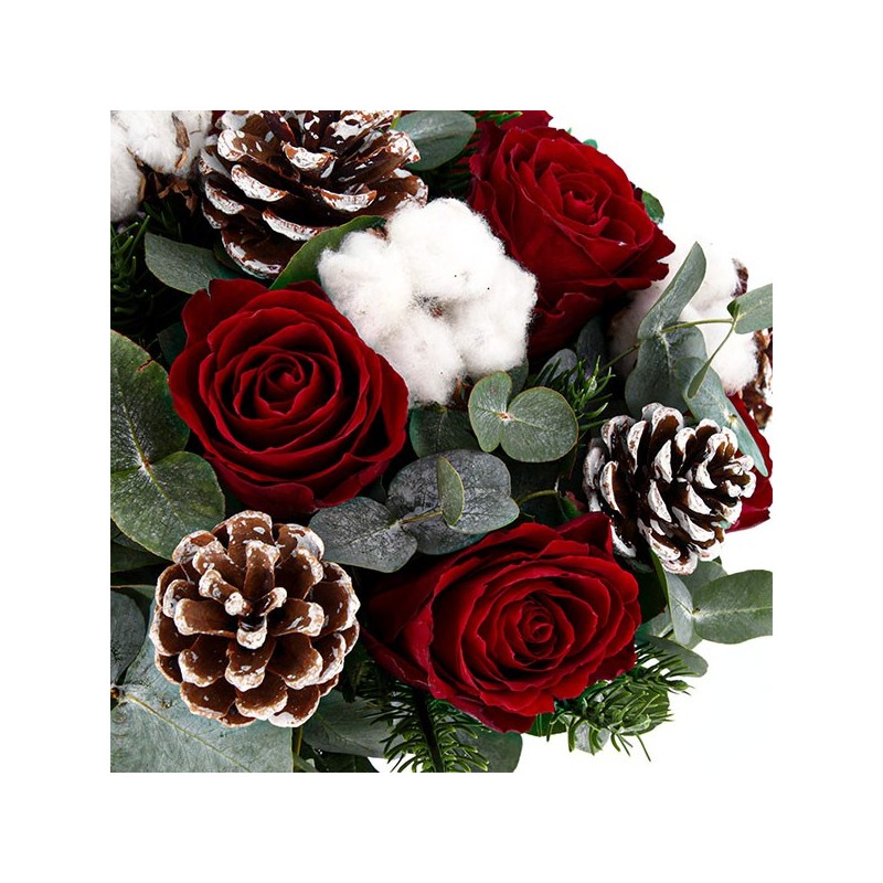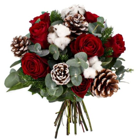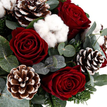 Bouquet rouge, blanc et vert, composé de roses, fleurs de coton, branches de sapin et décoration de Noël.