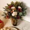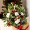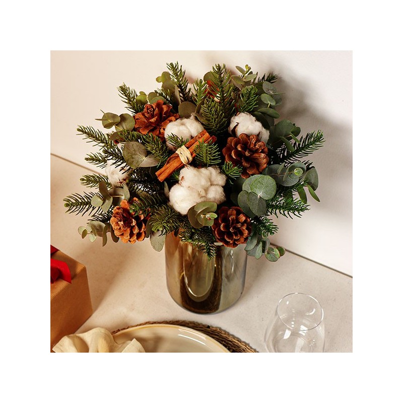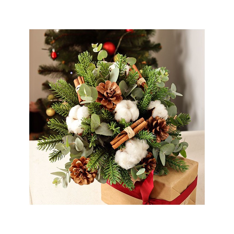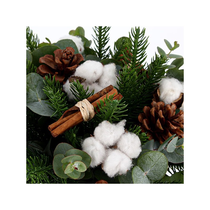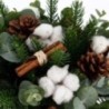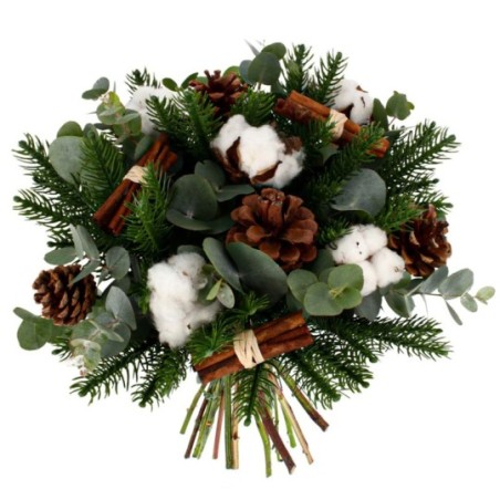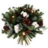 Bouquet blanc et vert, composé de fleurs de coton, branches de sapin et décoration de Noël.