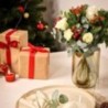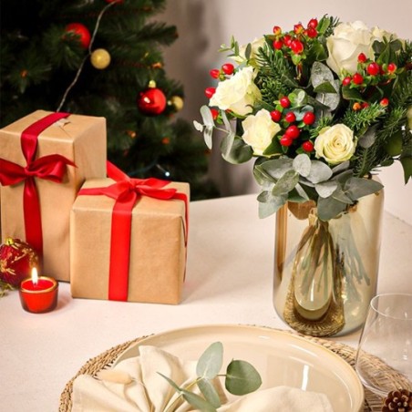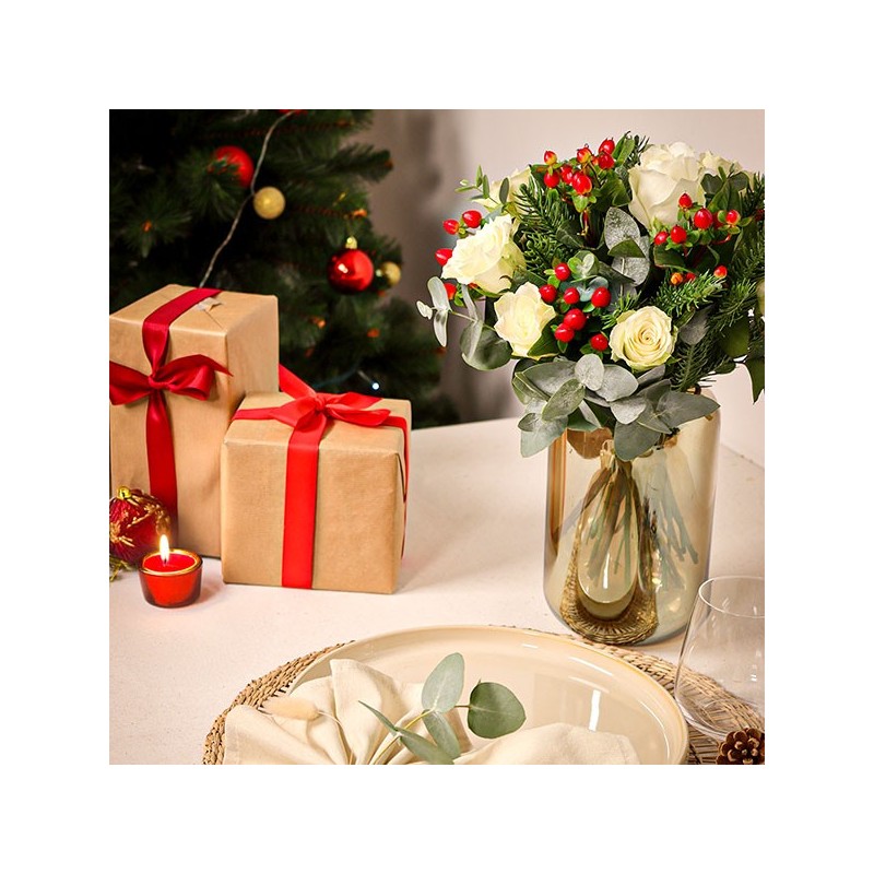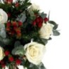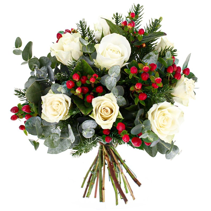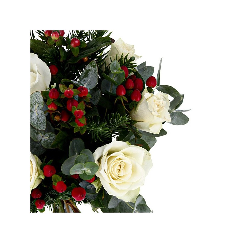 Bouquet blanc, rouge et vert, composé de roses, branches de sapin et petites baies rouges.