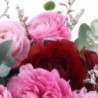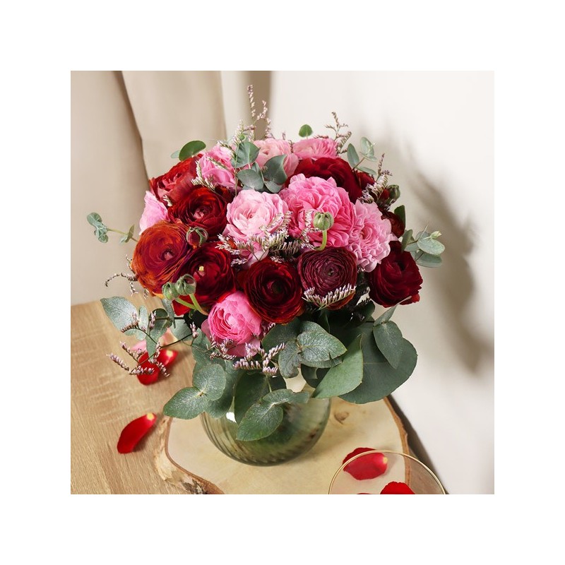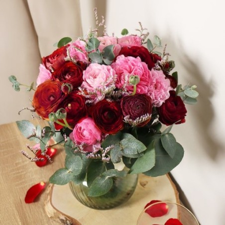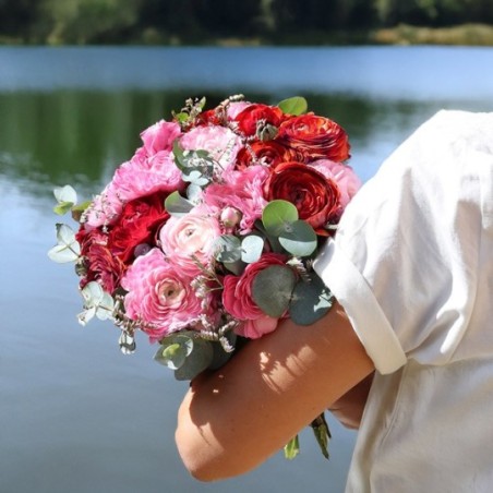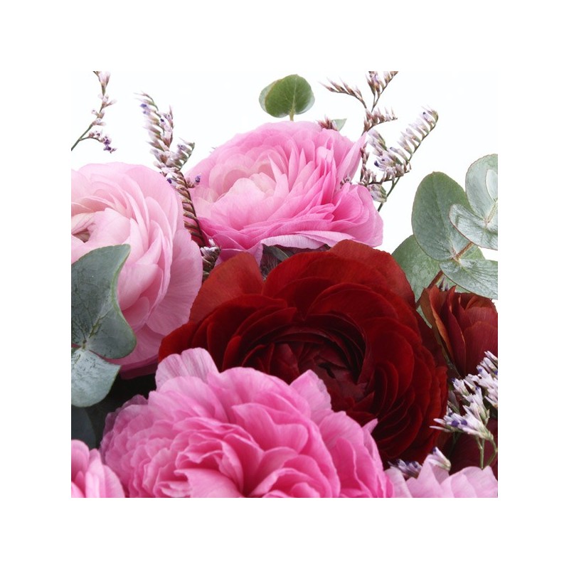 Bouquet dans les tons rouge et rose, composé de renoncules et de son feuillage.