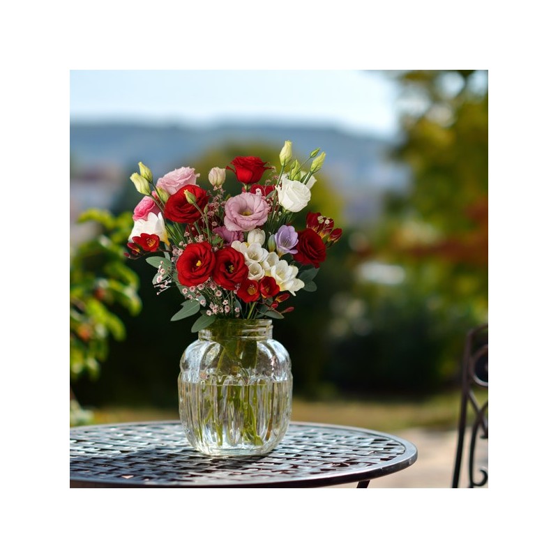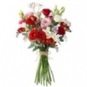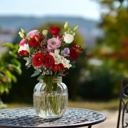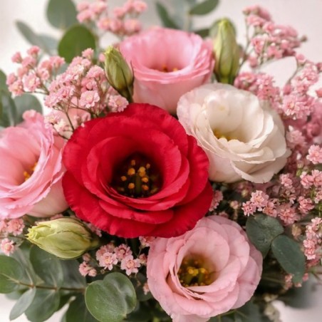 Bouquet de fleurs variées dans les tons rouges et pastel, composé de lisianthus et fleurettes, accompagné de feuillage.