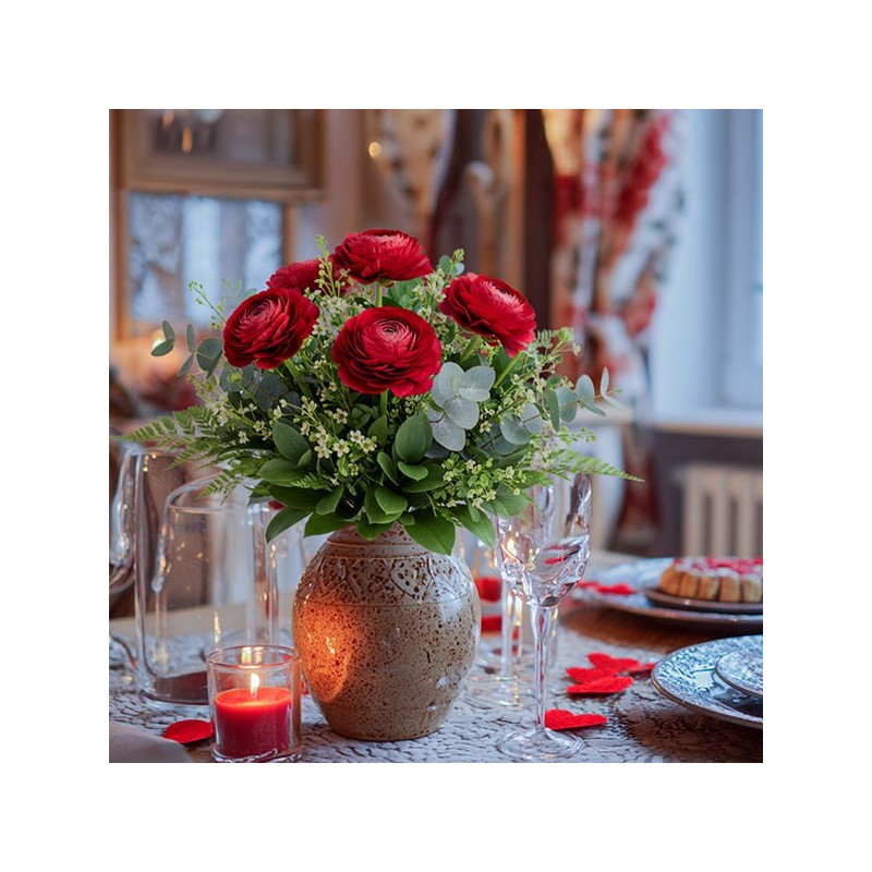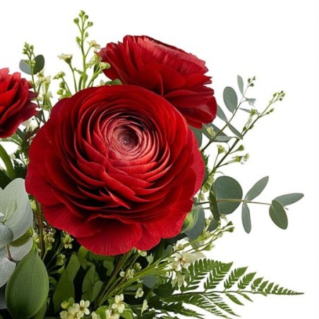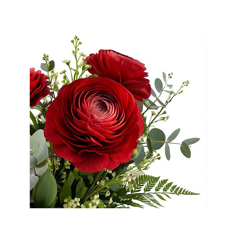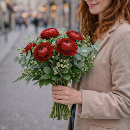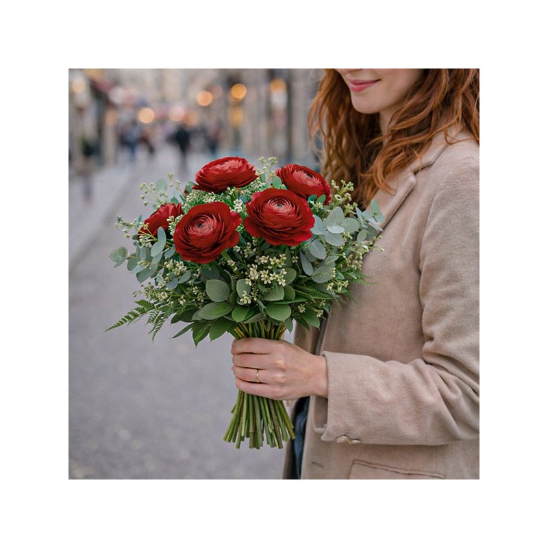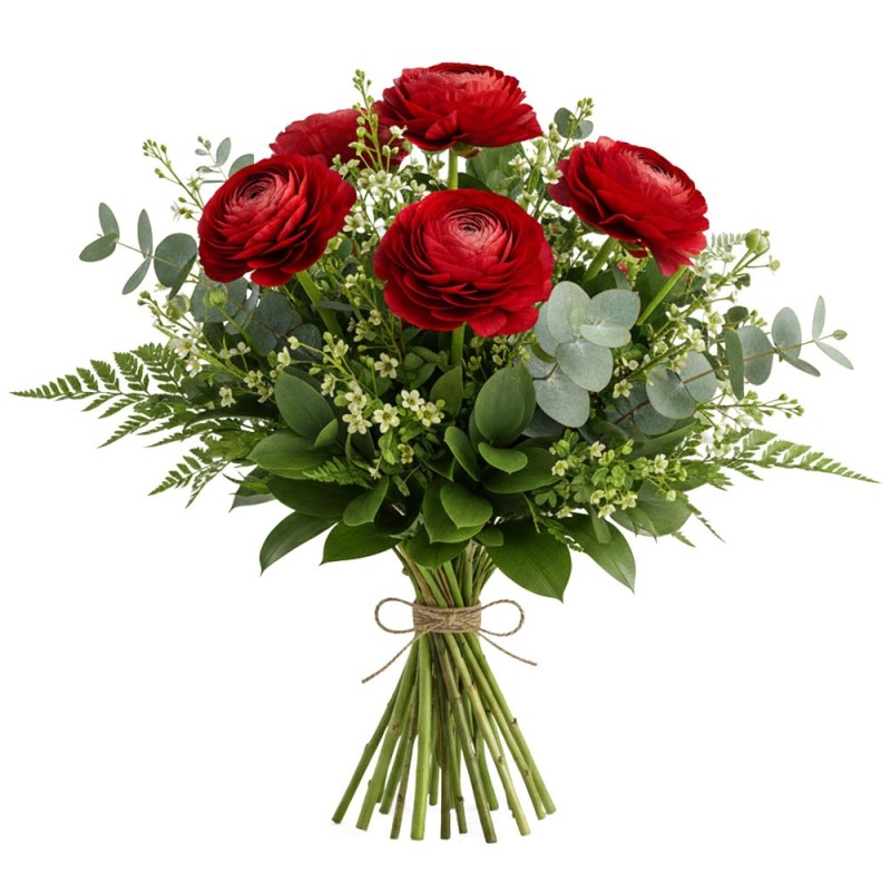 Bouquet de renoncules rouges accompagnées de feuillage.