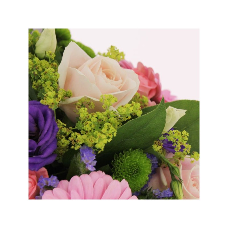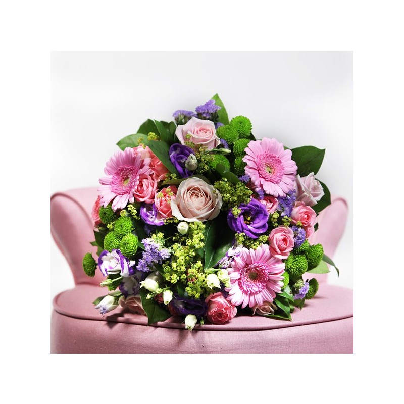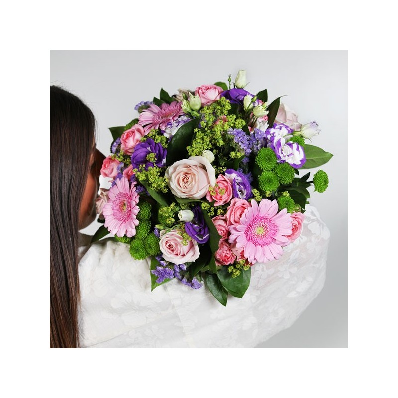 Bouquet rond dans les tons rose, fuchsia, violet et blanc composé de roses, gerberas, lisianthus fleurettes et feuillages.