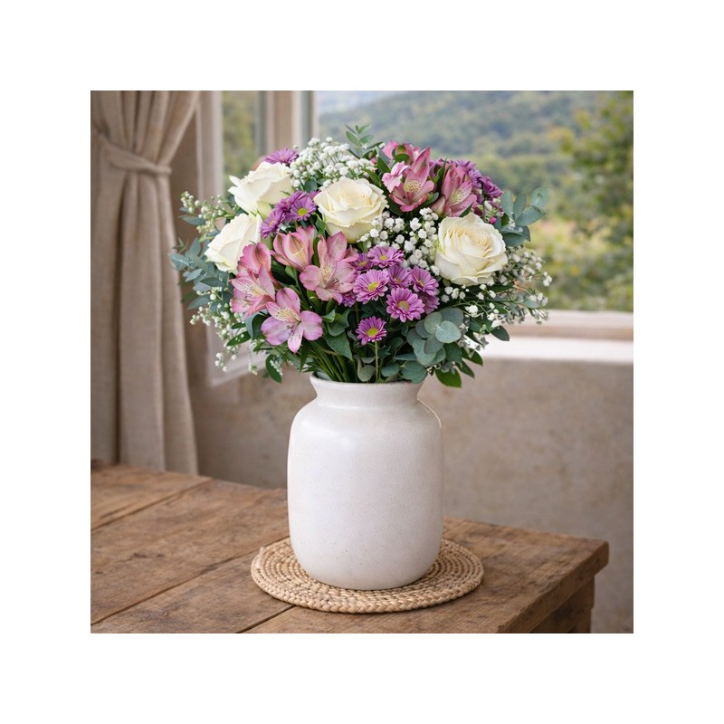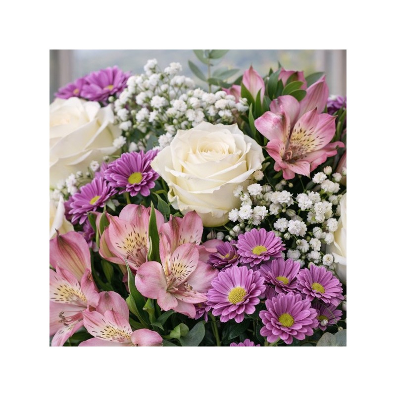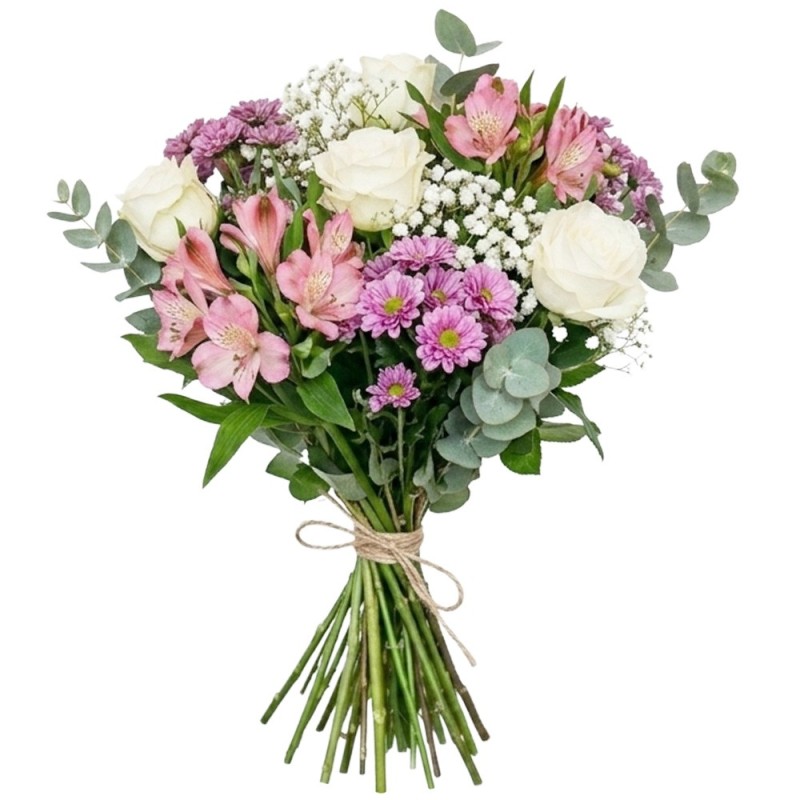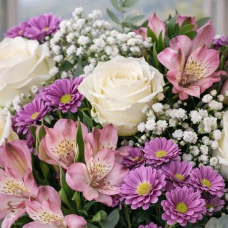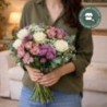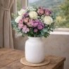 Bouquet dans un camaïeu de rose, composé de fleurs variées (roses, alstroemerias et fleurettes de saison) accompagné de feuillage.