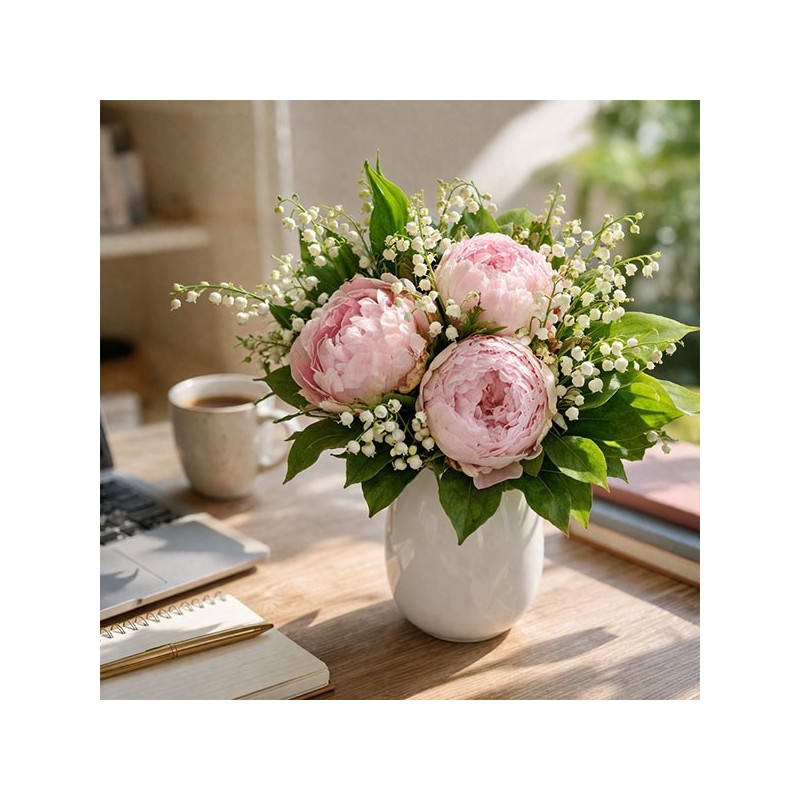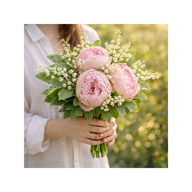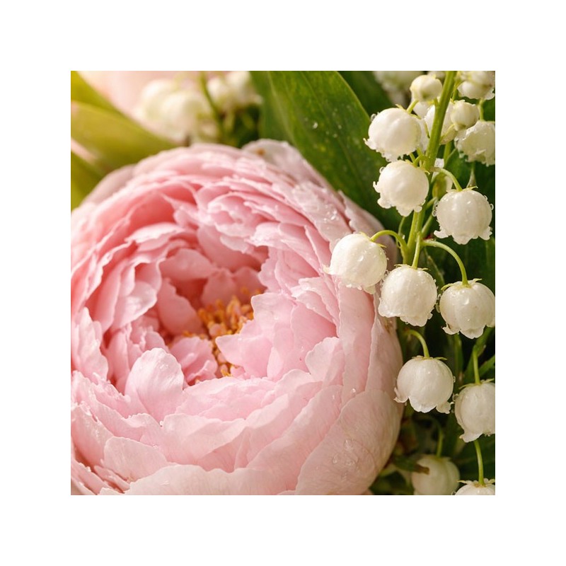 Bouquet de pivoines et brin de muguet. Coloris selon disponibilités du fleuriste en charge de votre commande.