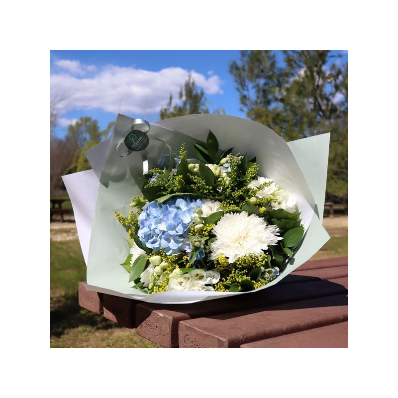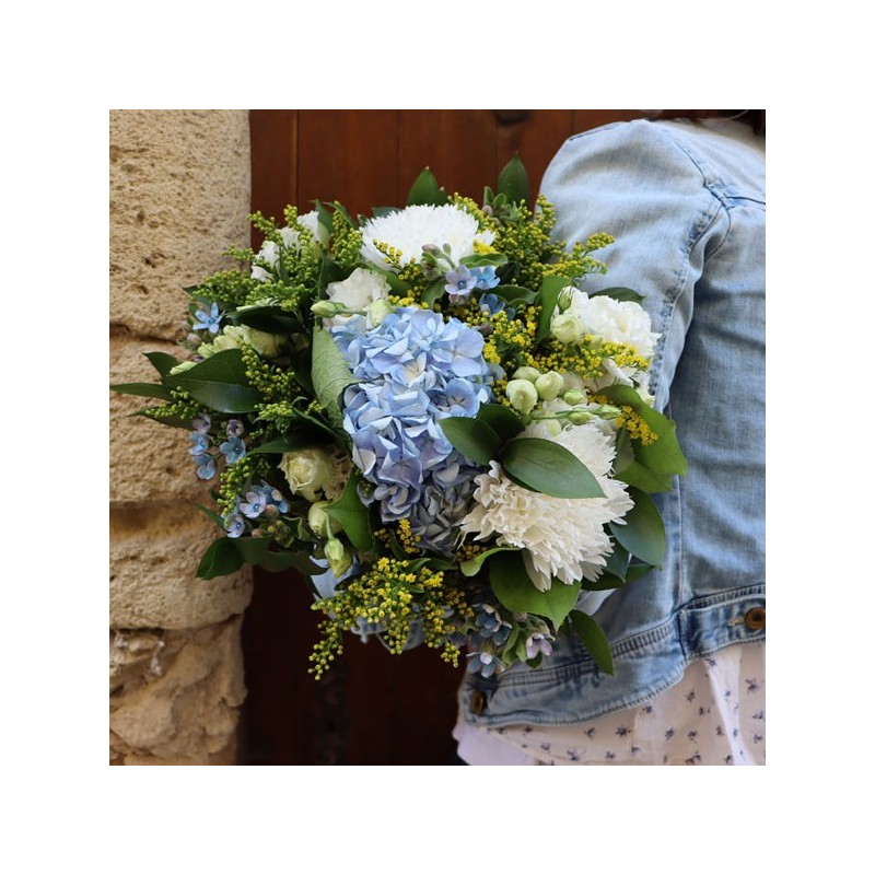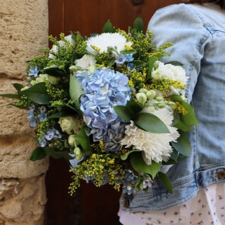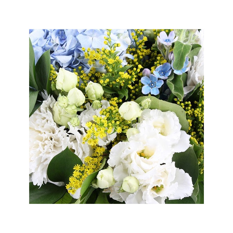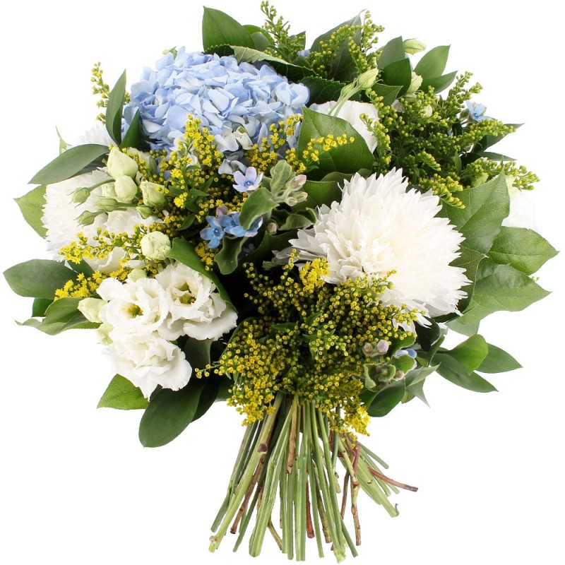 Bouquet dans les tons jaunes, blancs et bleus composé d'hortensias, de lisianthus, de chrysanthème, le tout accompagné de feuillage.