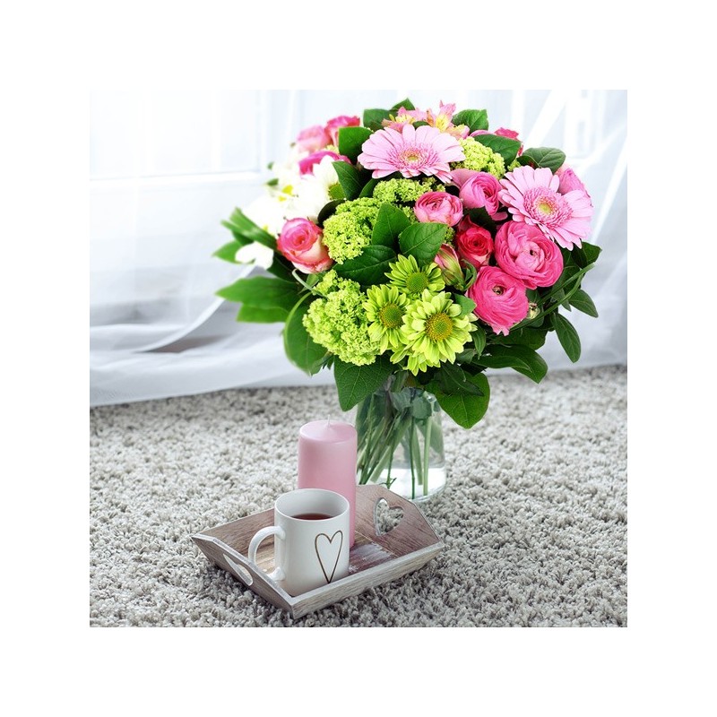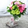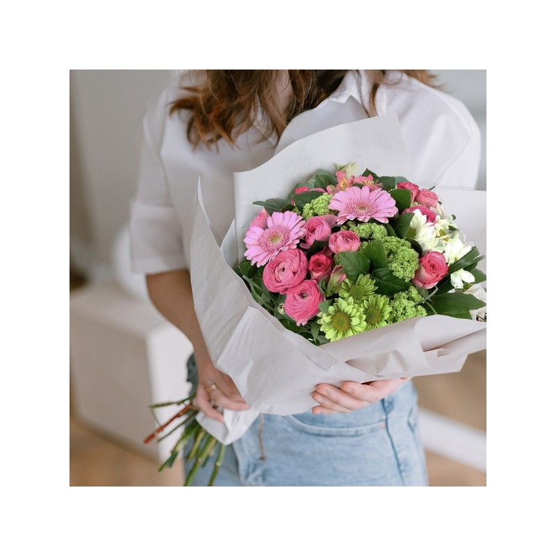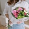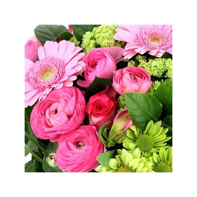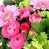 Bouquet rond dans les tons rose, blanc et vert composé de roses, germinis, chrysanthèmes et feuillages.