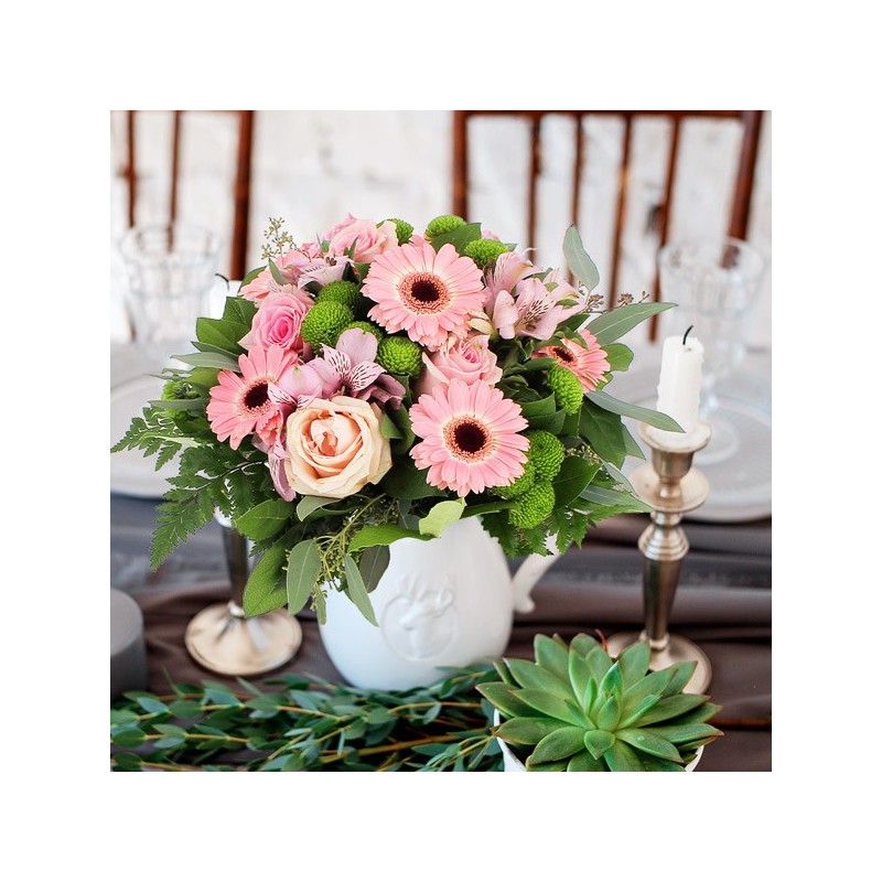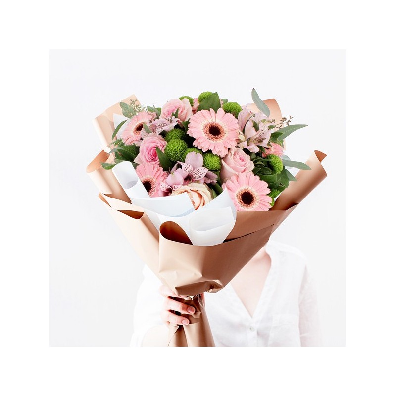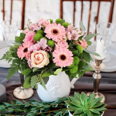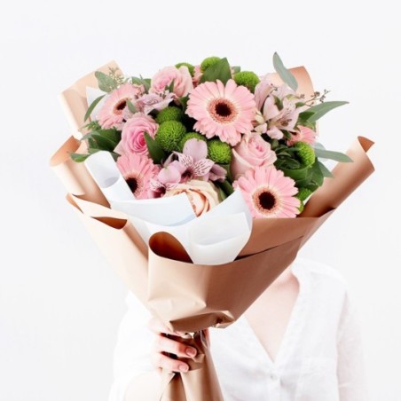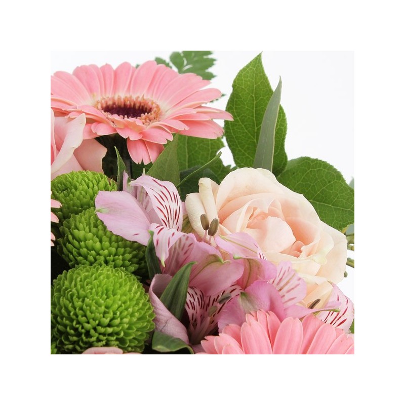 Bouquet rond dans les tons roses et verts, composé de roses, gerberas, alstromérias, santinis et feuillages.