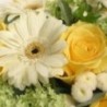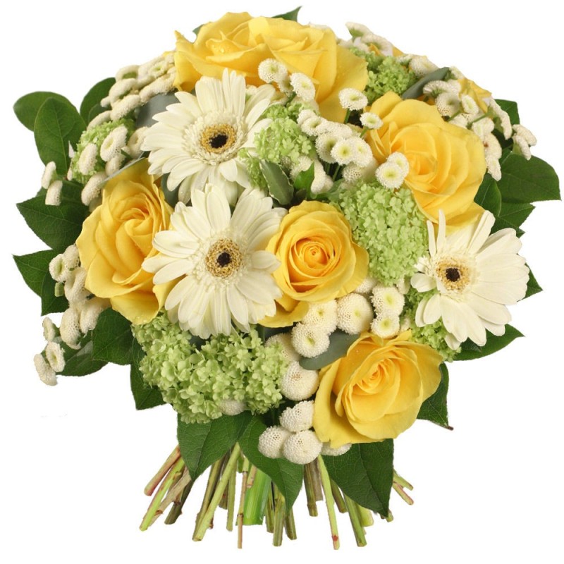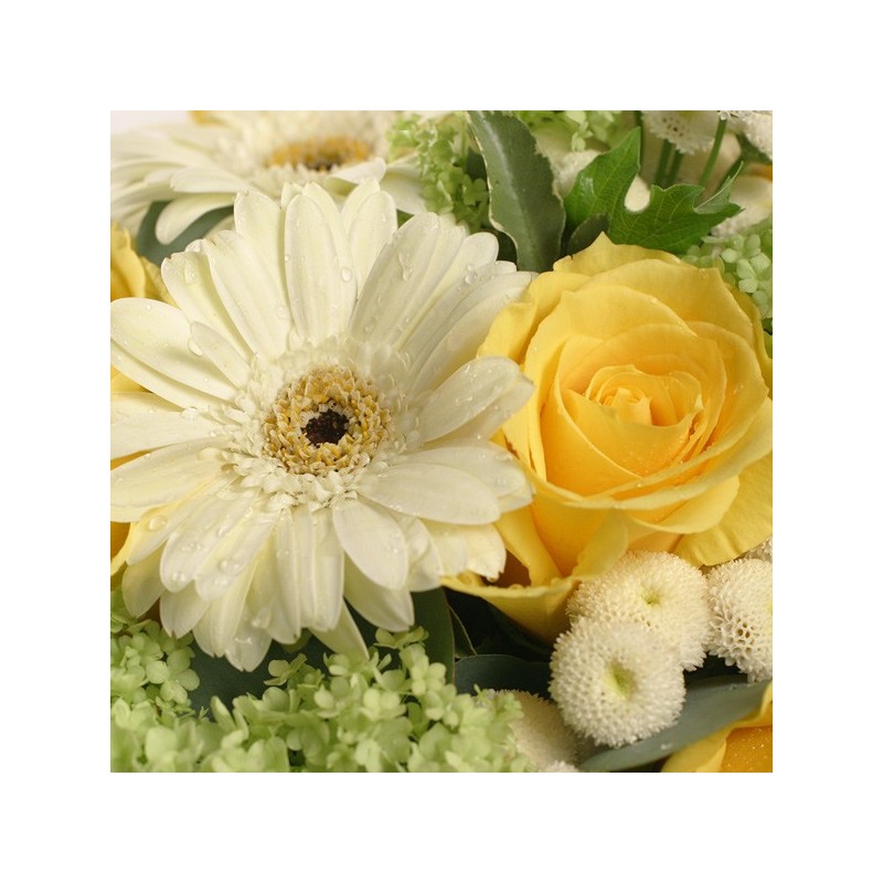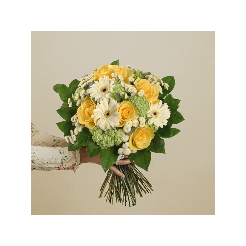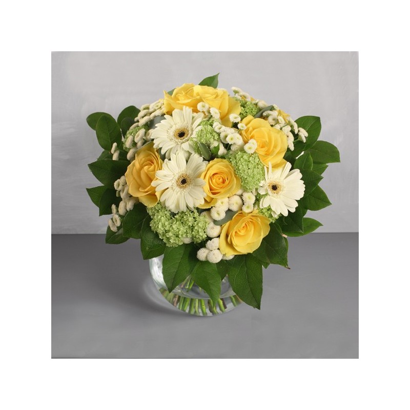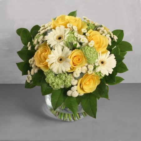 Bouquet rond dans les tons jaune, vert et blanc composé de roses, gerberas, camomilles et feuillages.