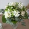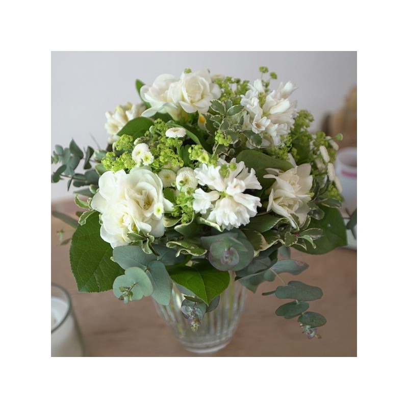 Bouquet dans les tons blancs composé d'alchemilles, lisianthus et jacinthes, accompagné de feuillage.