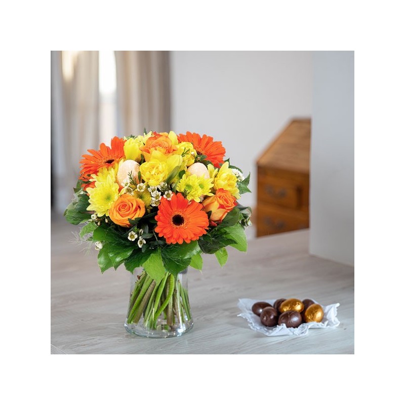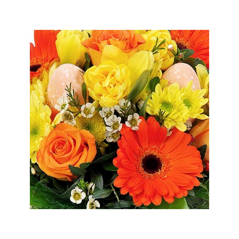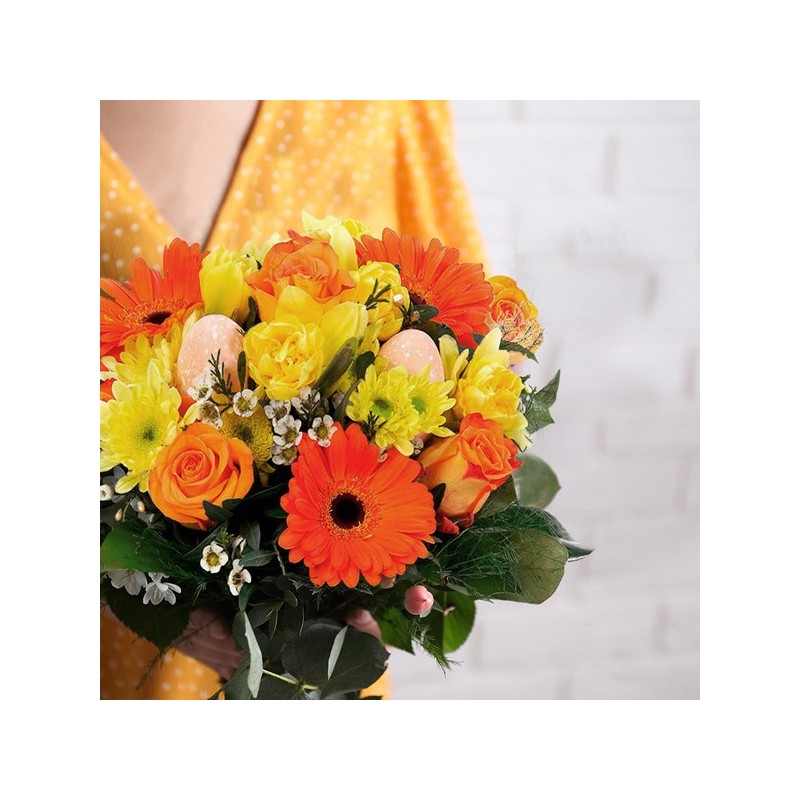 Bouquet de Pâques dans les tons orange et jaune composé de gerberas, roses et autres fleurs de saison avec des décorations de Pâques et du feuillage.
