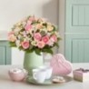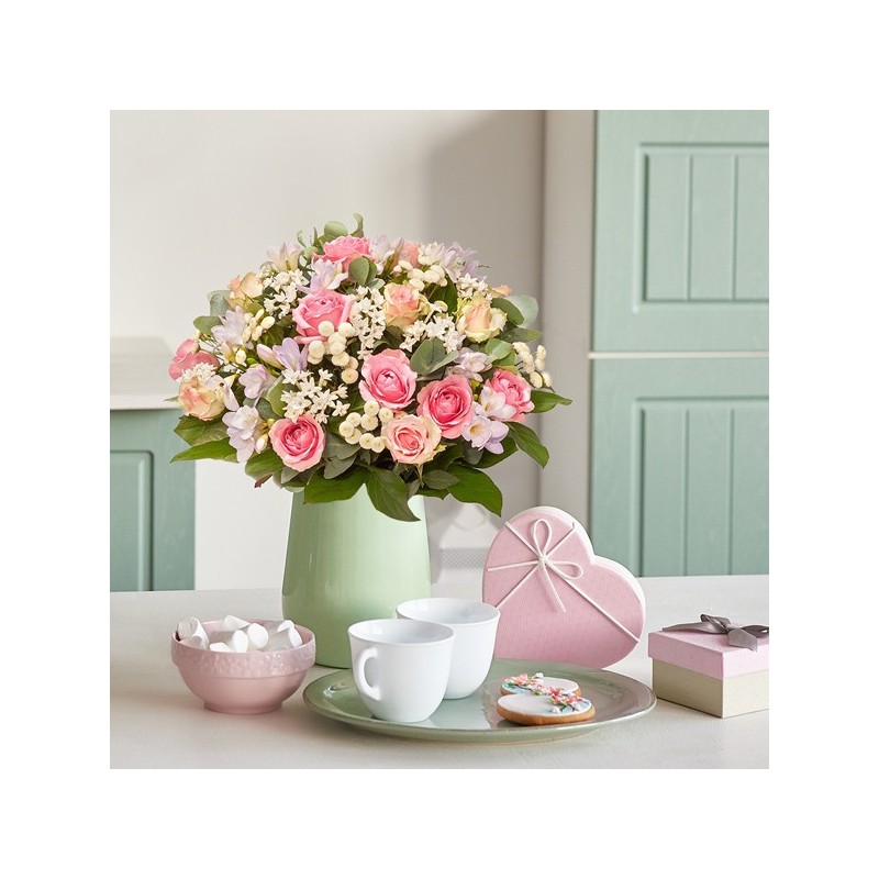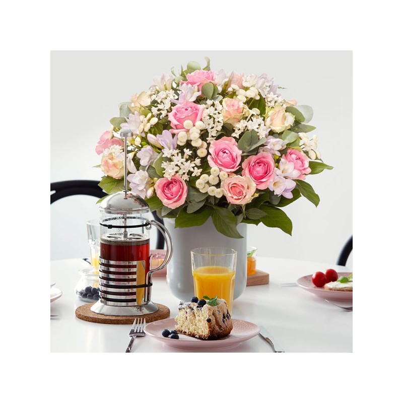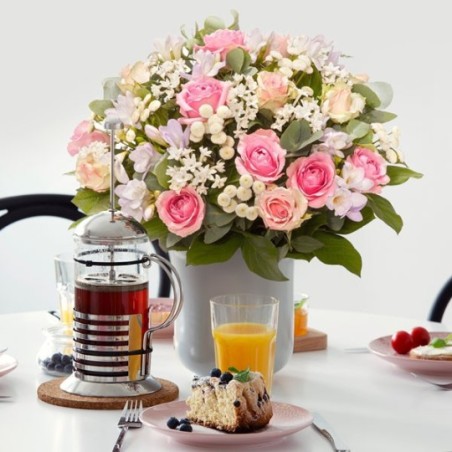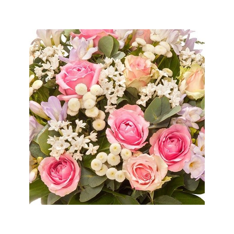 Bouquet rond dans les tons rose pâle, parme et blanc composé de roses, freesias, matricaires et feuillages.