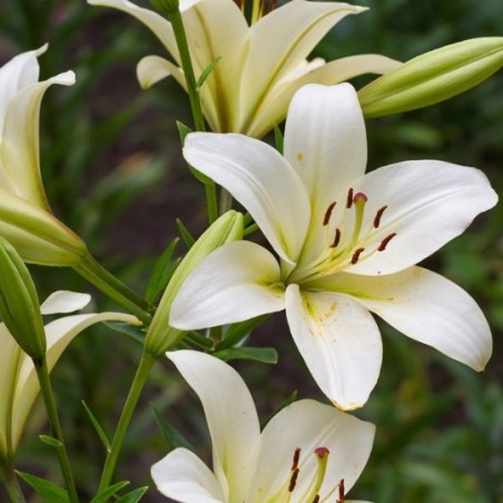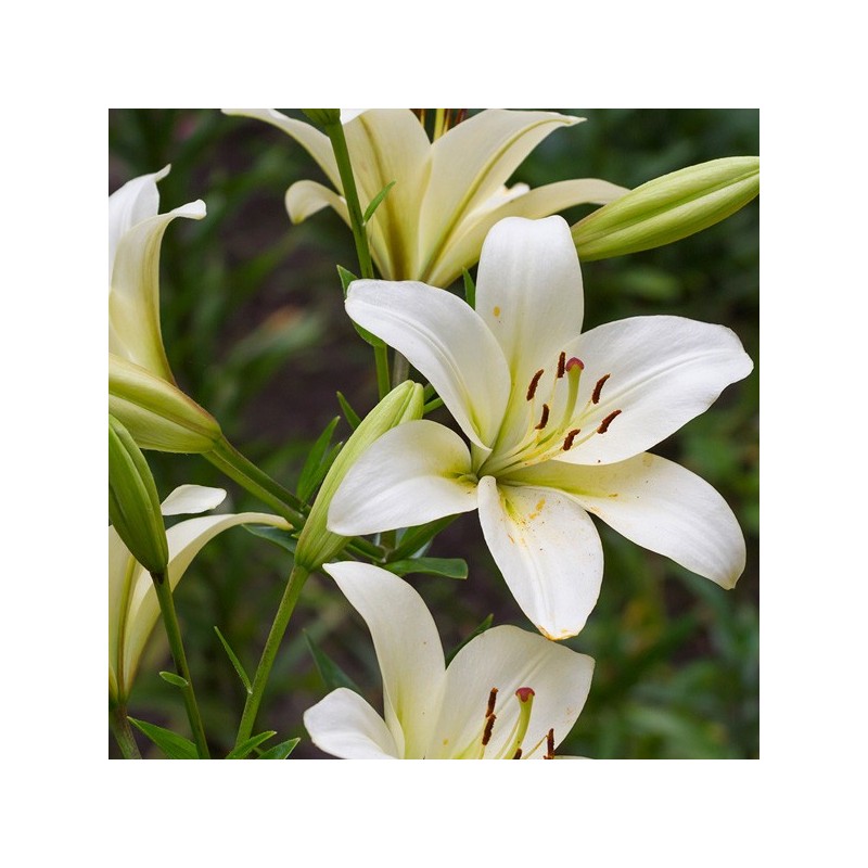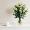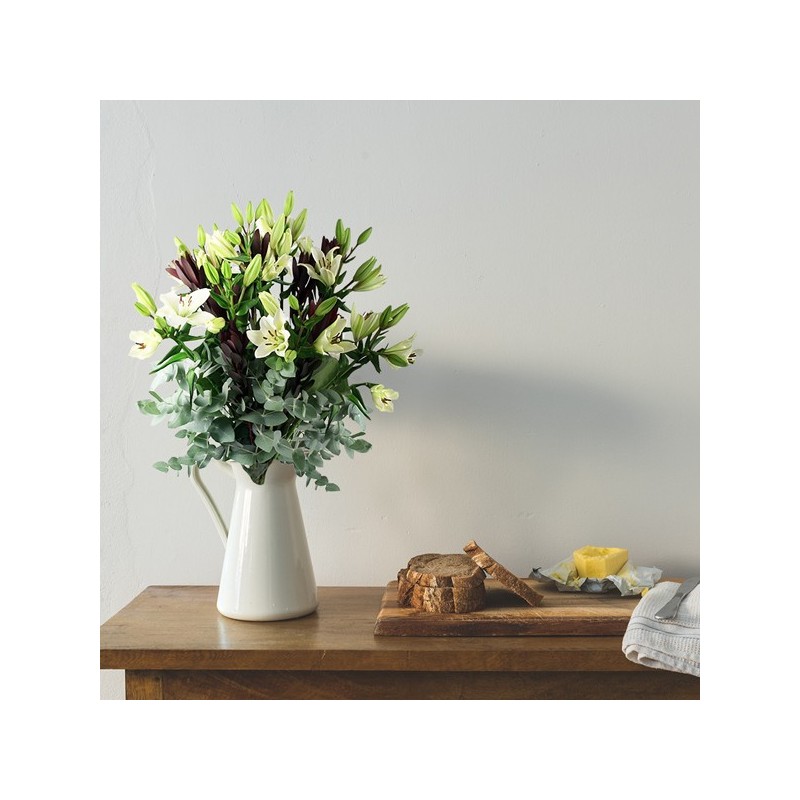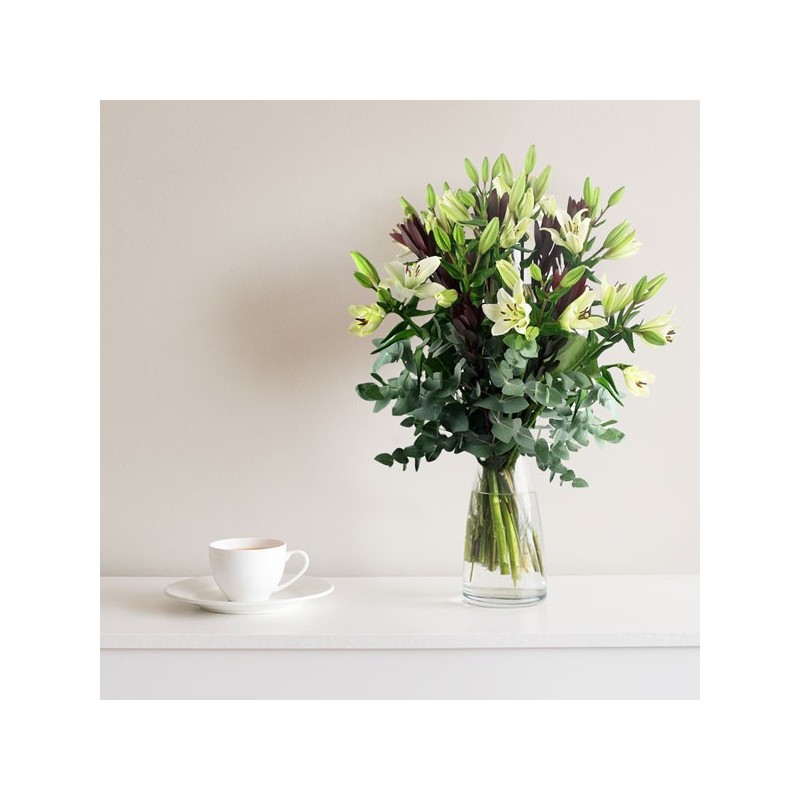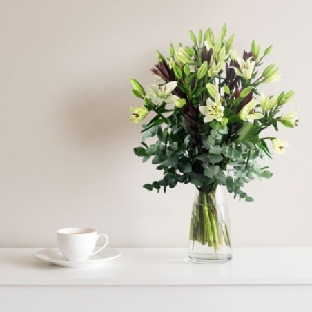 Bouquet longues tiges composé de lys blanc et eucalyptus.