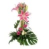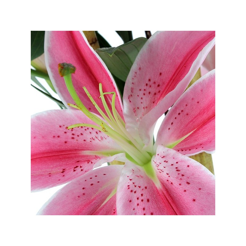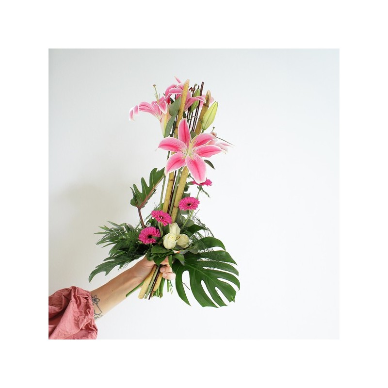 Bouquet longues tiges dans les tons rose, blanc et vert composé de roses, lys, gerberas et feuillages.