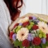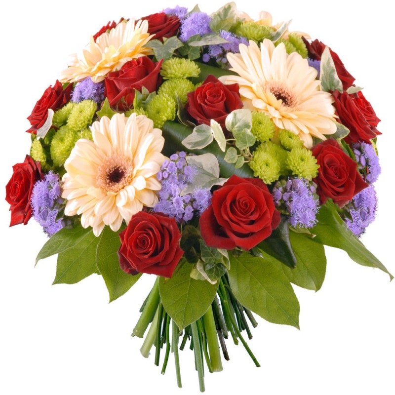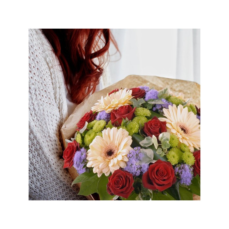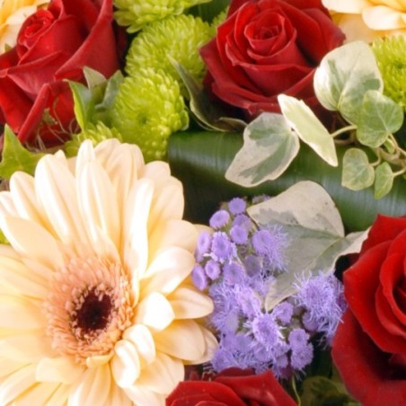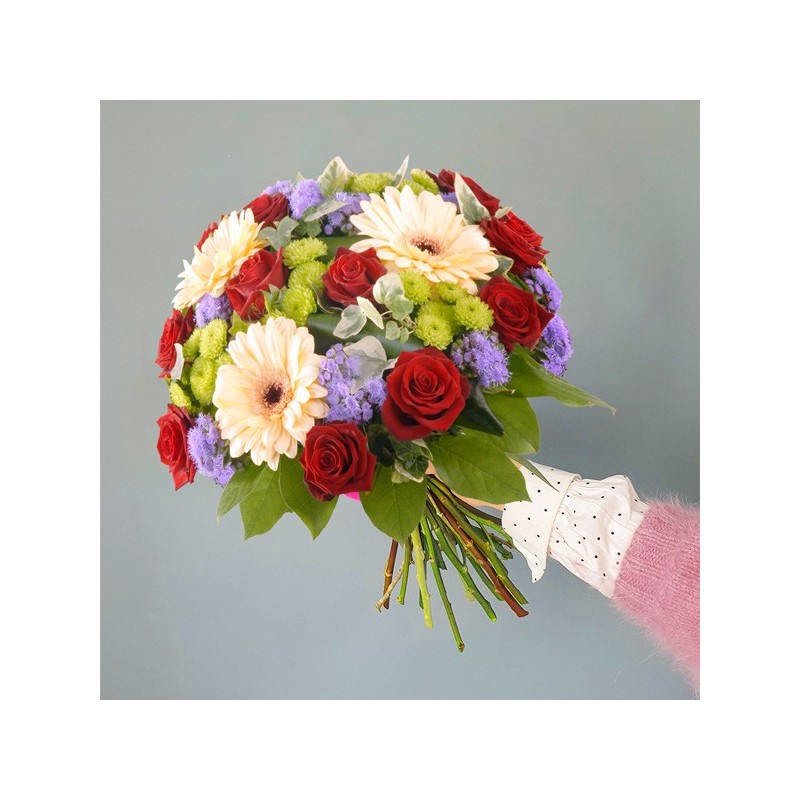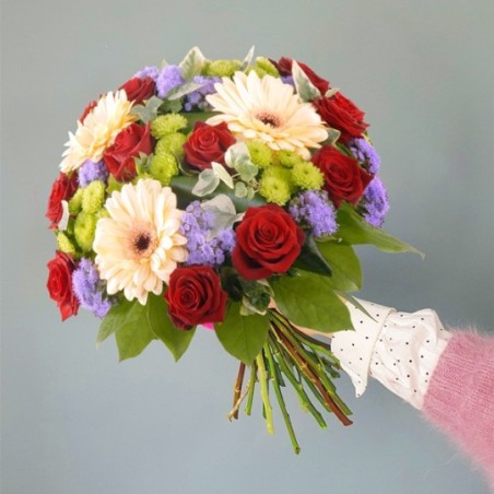 Bouquet rond dans les tons rouge, crème, violet et vert composé de roses, gerberas, santinis, agératum et feuillages.