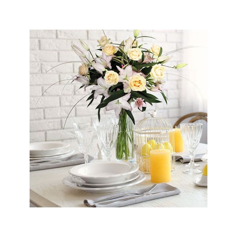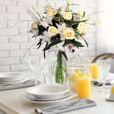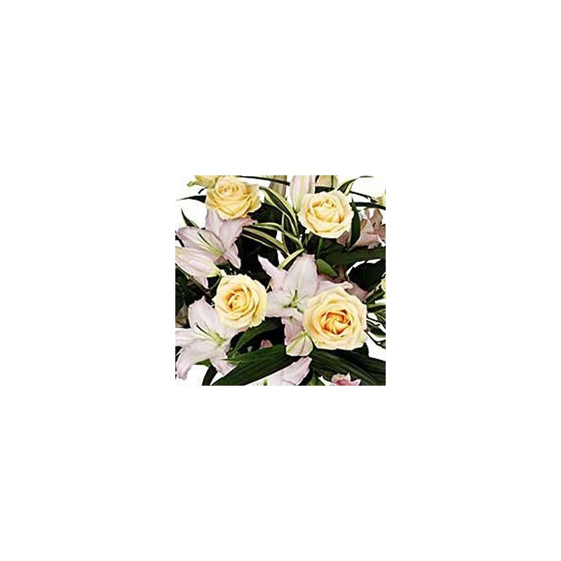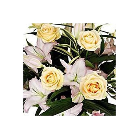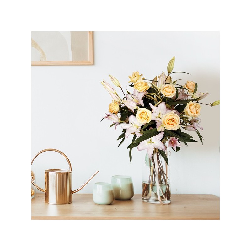 Bouquet longues tiges dans les tons rose et crème composé de lys, roses et feuillages.