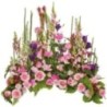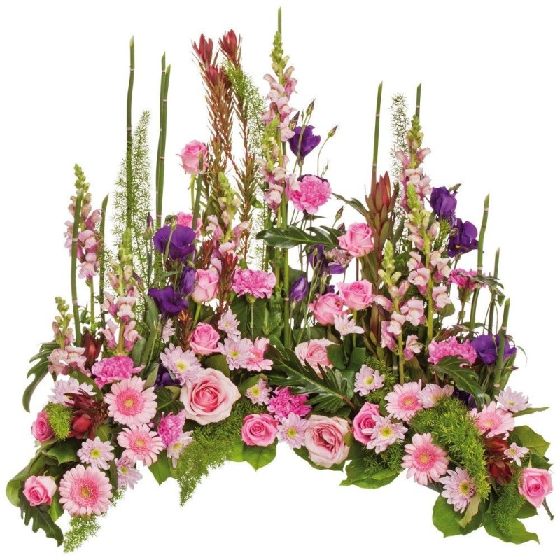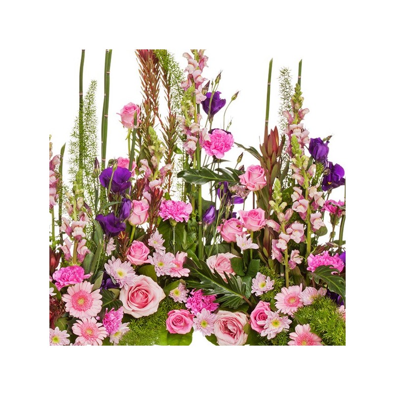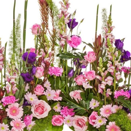 Devant de tombe dans les tons rose, mauve et vert composé d'asparagus, mufliers, roses aqua, oeillets roses, lisianthus, leucodendron, germinis, prele, salal, roses sweet, philosanadu et chrysanthèmes.