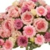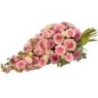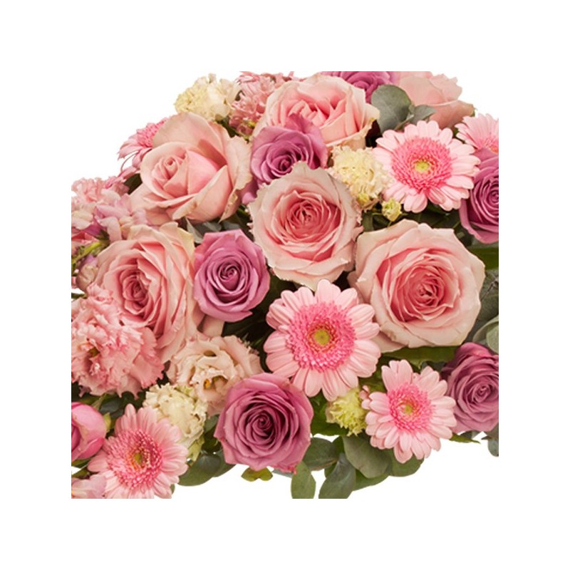 Gerbe piquée dans les tons de rose avec une pointe de mauve composé de roses roses, roses mauves, germinis roses, mufliers, lysianthus, salal et eu...