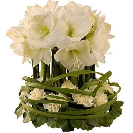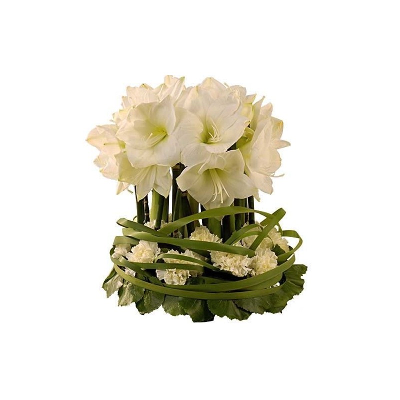 Composition dans les tons de blanc et vert composée essentiellement d'amaryllis blancs, œillets blancs mis à la base, et galax (le contenant peut varier en fonction des disponibilités chez le fleuriste).