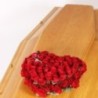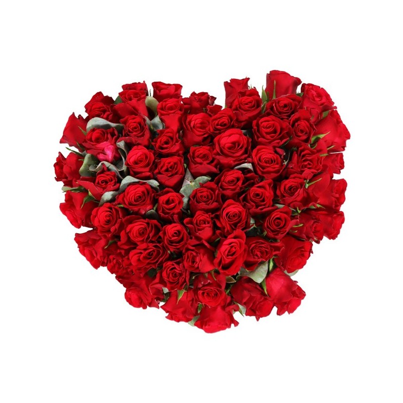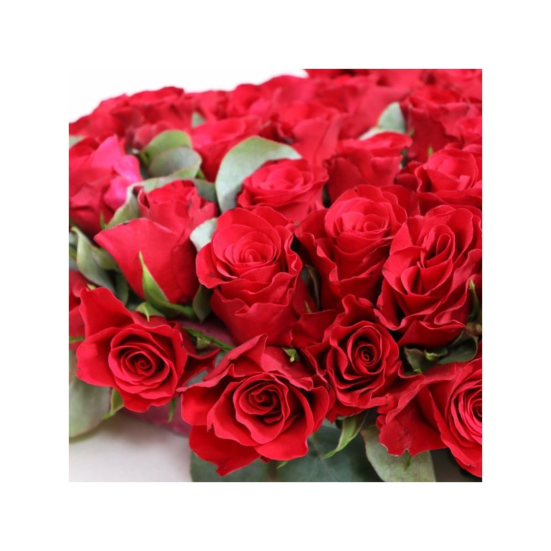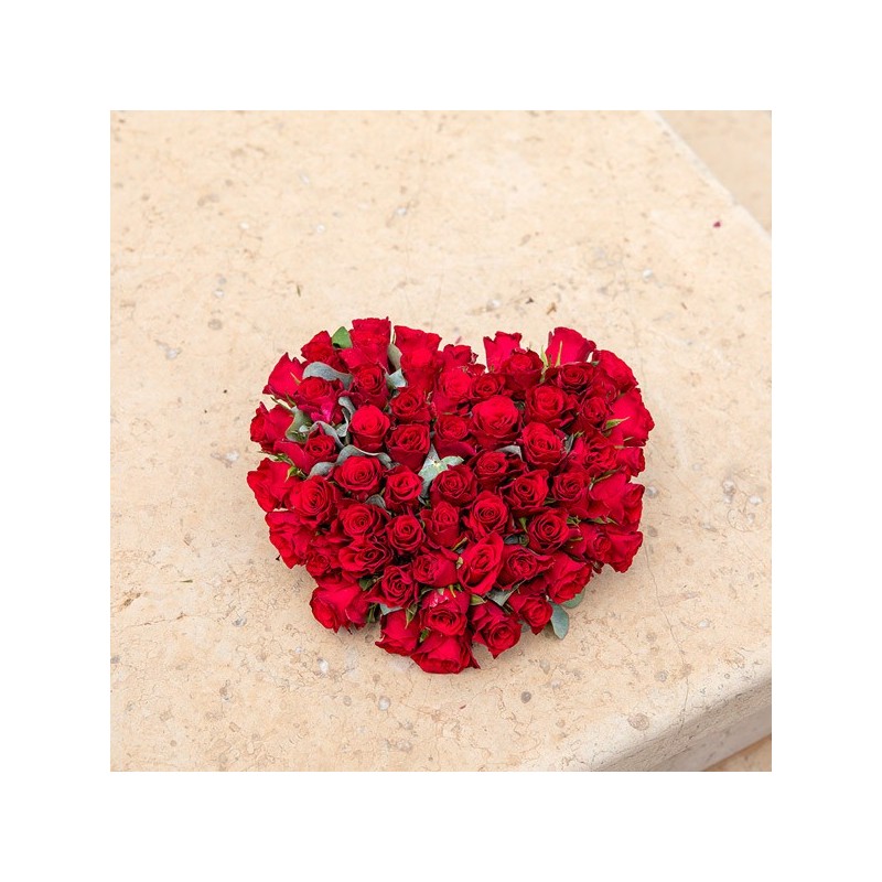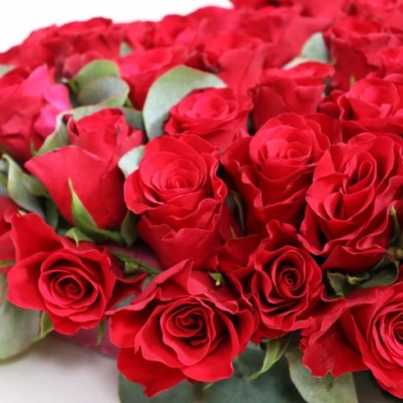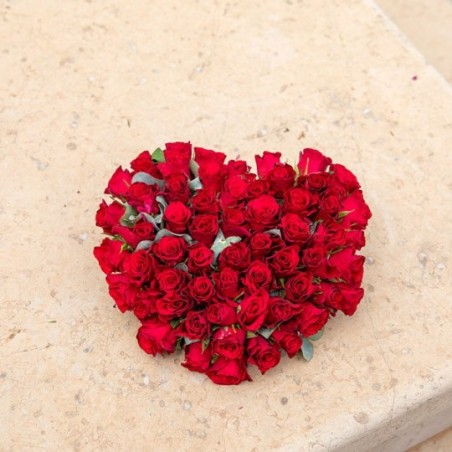 Cœur dans les tons rouges composé de roses, baies noires et du feuillage.