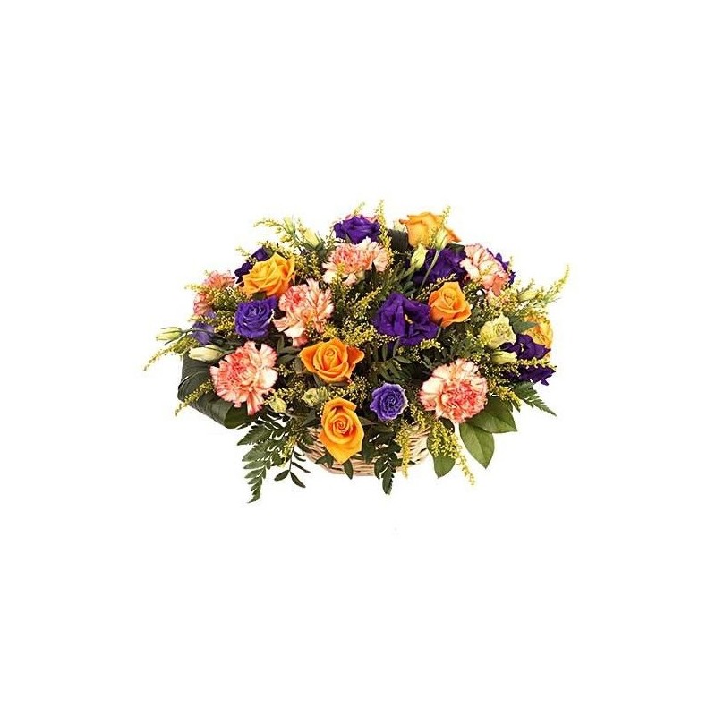 Composition florale de deuil ronde dans les tons rose pale, orange et mauve composée de roses, œillets, lisianthus et autres fleurs dans un panier sans anse en osier (le contenant peut varier en fonction des disponibilités).