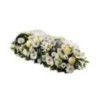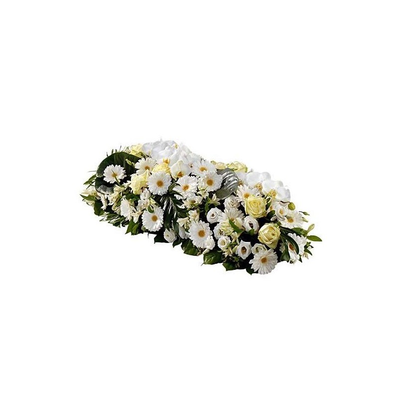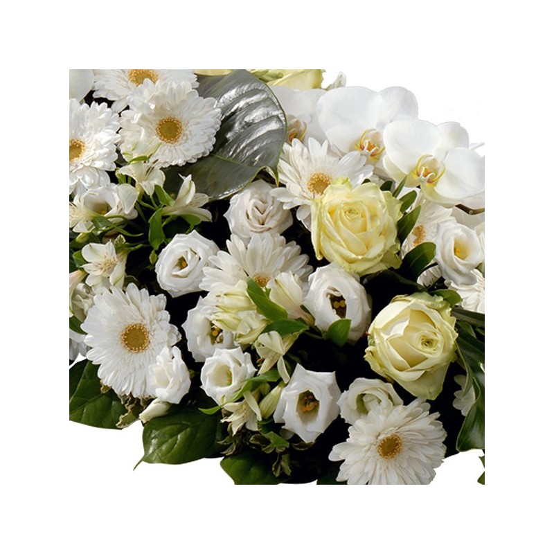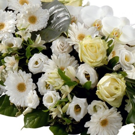 Raquette dans les tons blancs et crème composée de germinis, roses, phalaenopsis, lisianthus et autres végétaux.