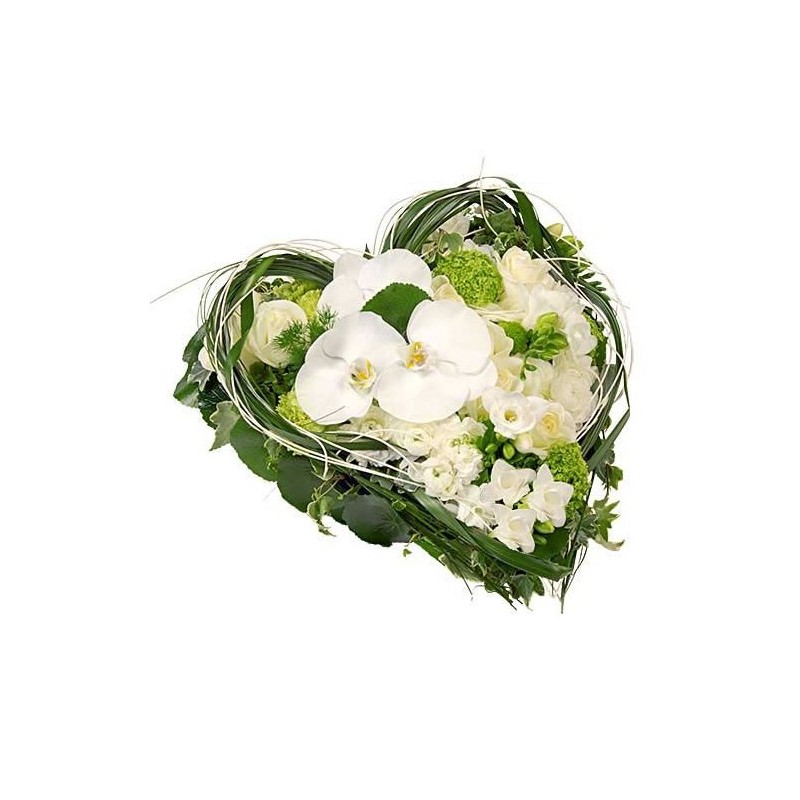 Cœur dans les tons de blanc composé de roses, de fleurs de phalaenopsis et d'autres fleurs ainsi que du feuillage.