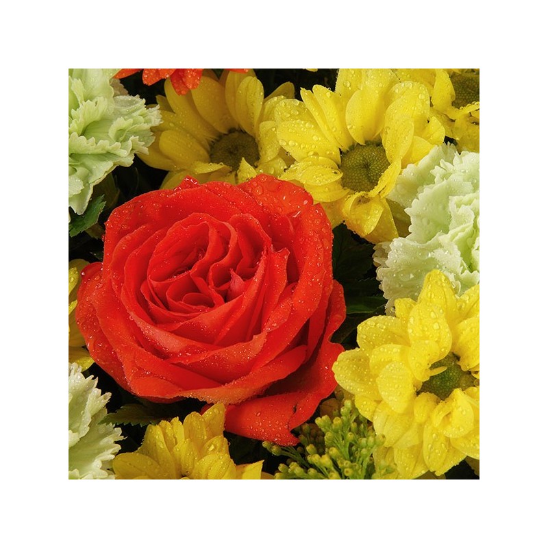 Coussin de deuil dans les tons jaune et orange, composé de germinis, roses, santinis et autres fleurs de saison, le tout accompagné de feuillage.