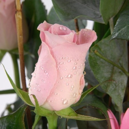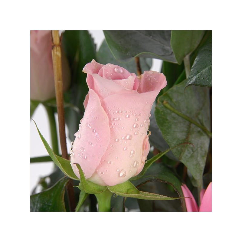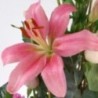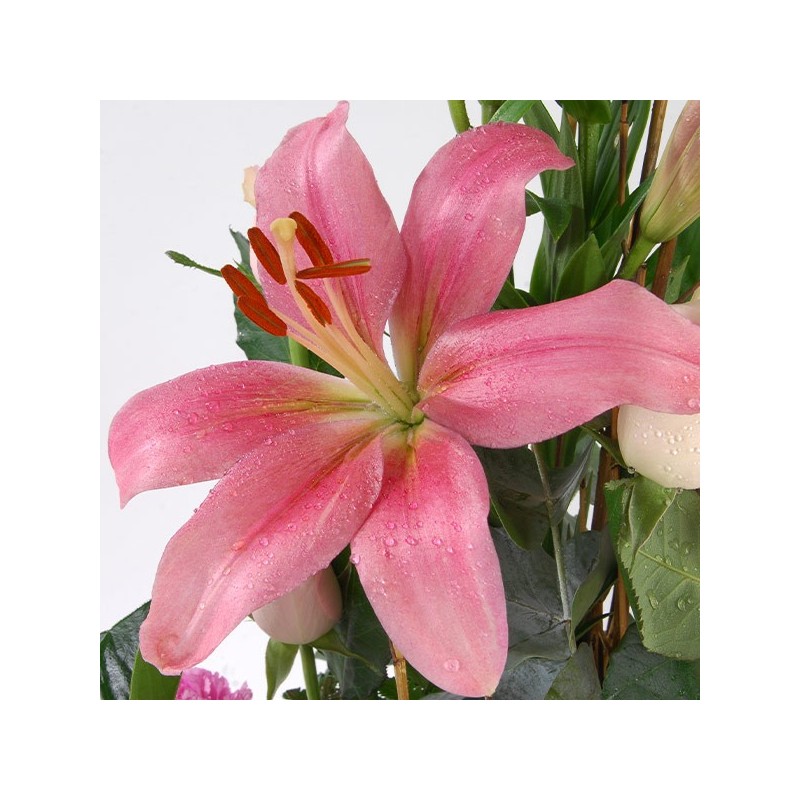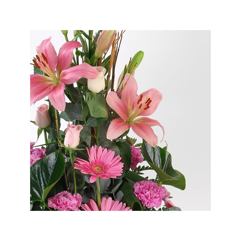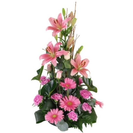Devant de tombe dans les tons roses composé de lys, gerberas, roses et autres fleurs de saison, le tout piqué dans de la mousse avec du feuillage.