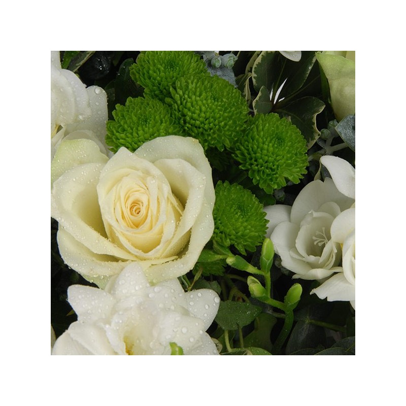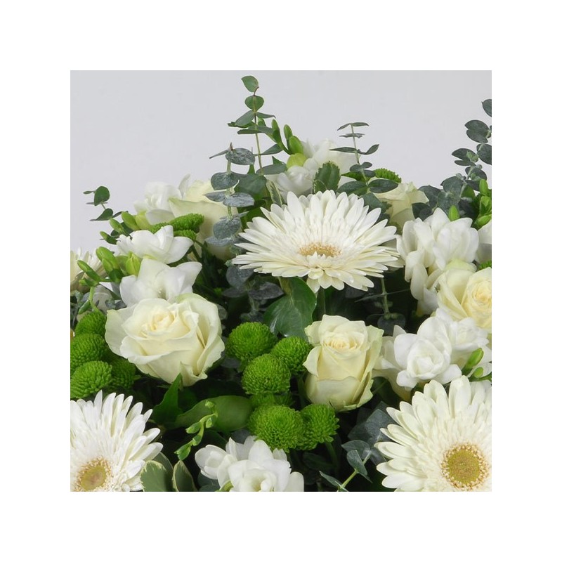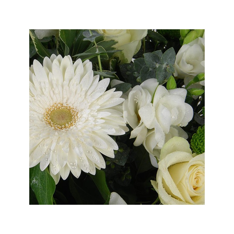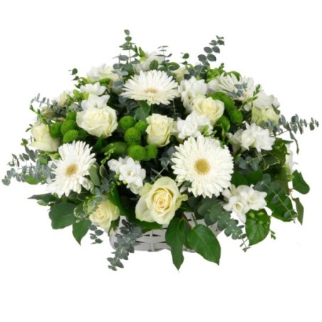 Panier de deuil dans les tons blanc et vert composé de gerberas, roses et freesias le tout accompagné de feuillage et de son panier. (le contenant peut varier en fonction de la disponibilité du fleuriste en charge de votre commande. )