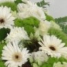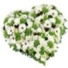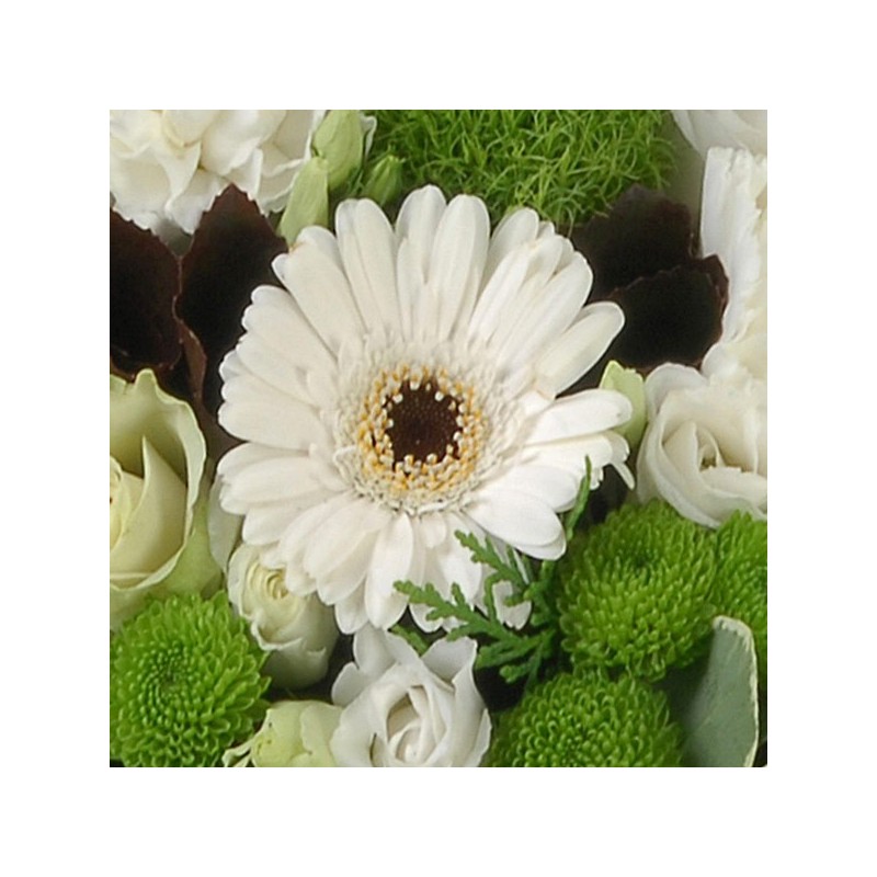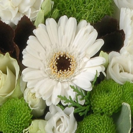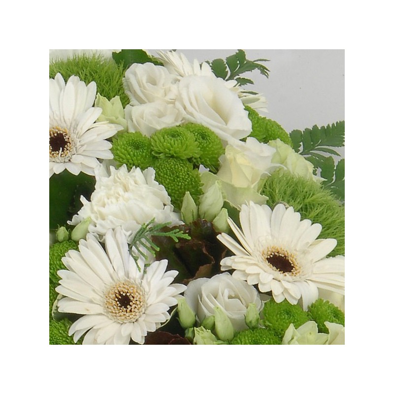 Composition piquée en forme de coeur dans les tons blancs et verts composée d'oeillets, de germinis, de roses et autres fleurs de saison.