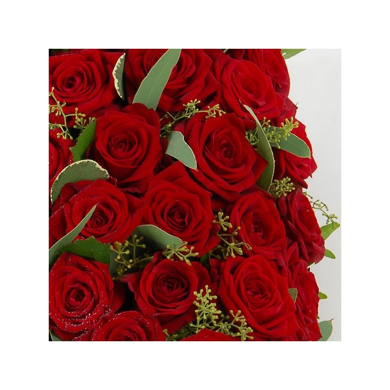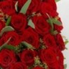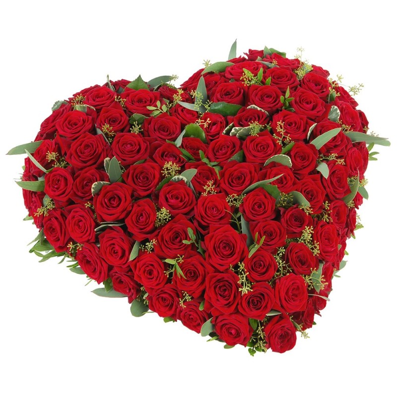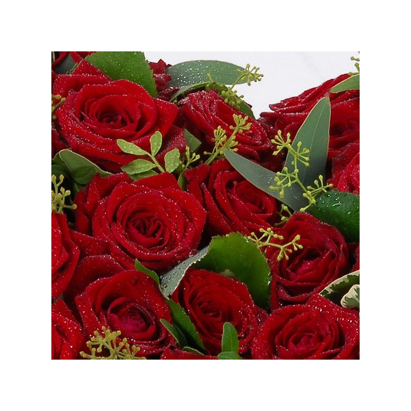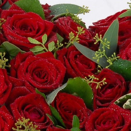 Composition piquée en forme de coeur dans les tons rouges composée de roses et accompagnée de feuillage.