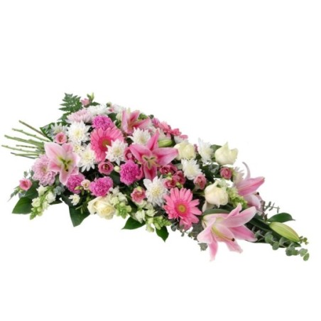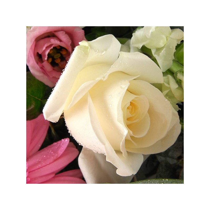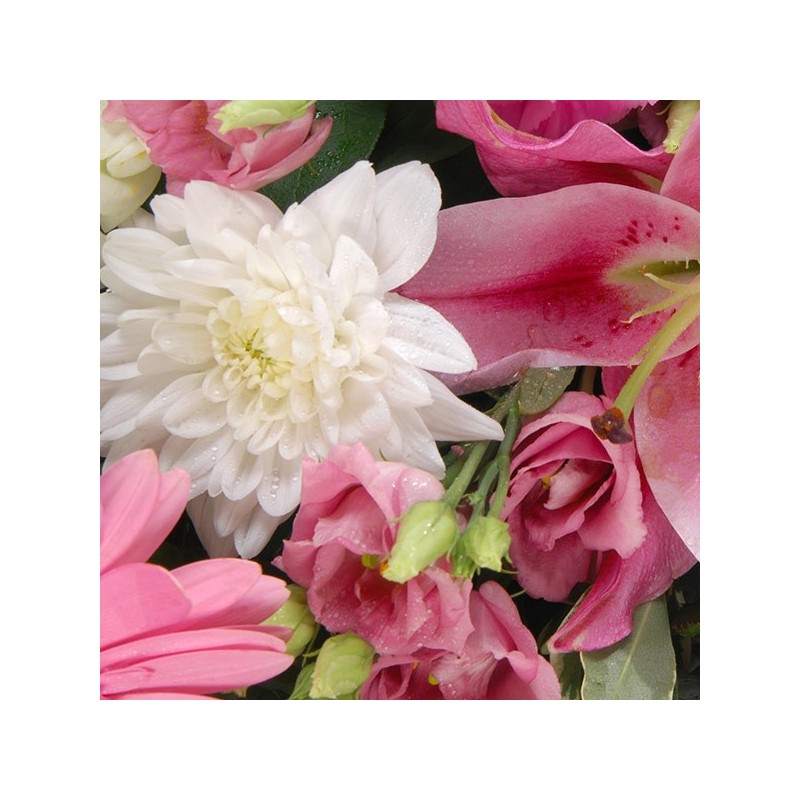 Gerbe piquée dans les tons blanc et rose composée de lys, roses, œillets et autre fleurs de saison le tout accompagné de feuillage.