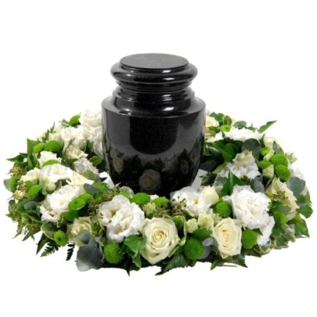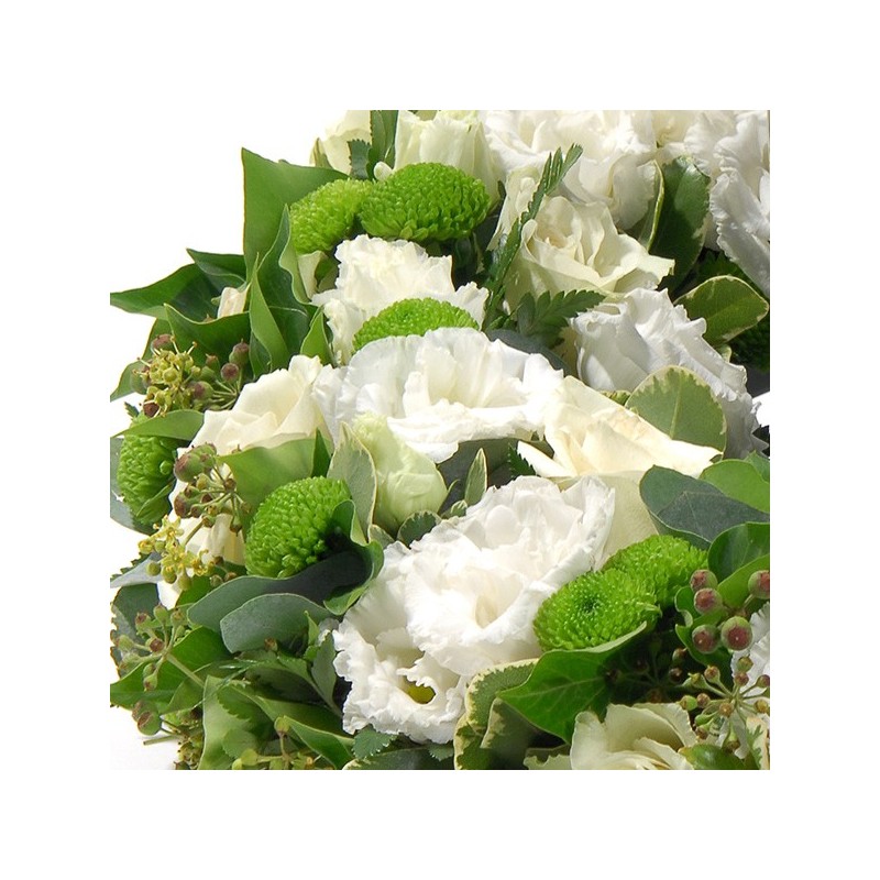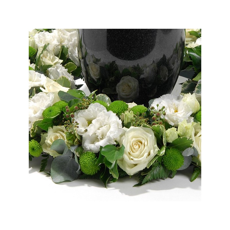 Couronne pour urne de deuil dans les tons blanc et vert composée de roses, lysianthus et feuillage. Urne non fournie.